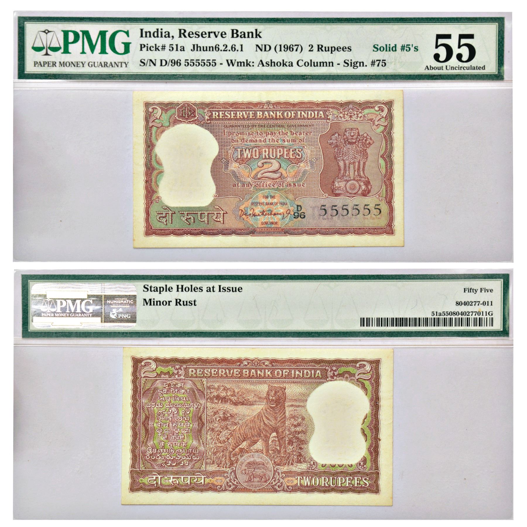 2 rupees, fancy number, Tiger series, ND (1962-1967), signed by P.C. Bhattacharya, without inset, serial no.: D96 555555. J&R 6.2.6.1.
