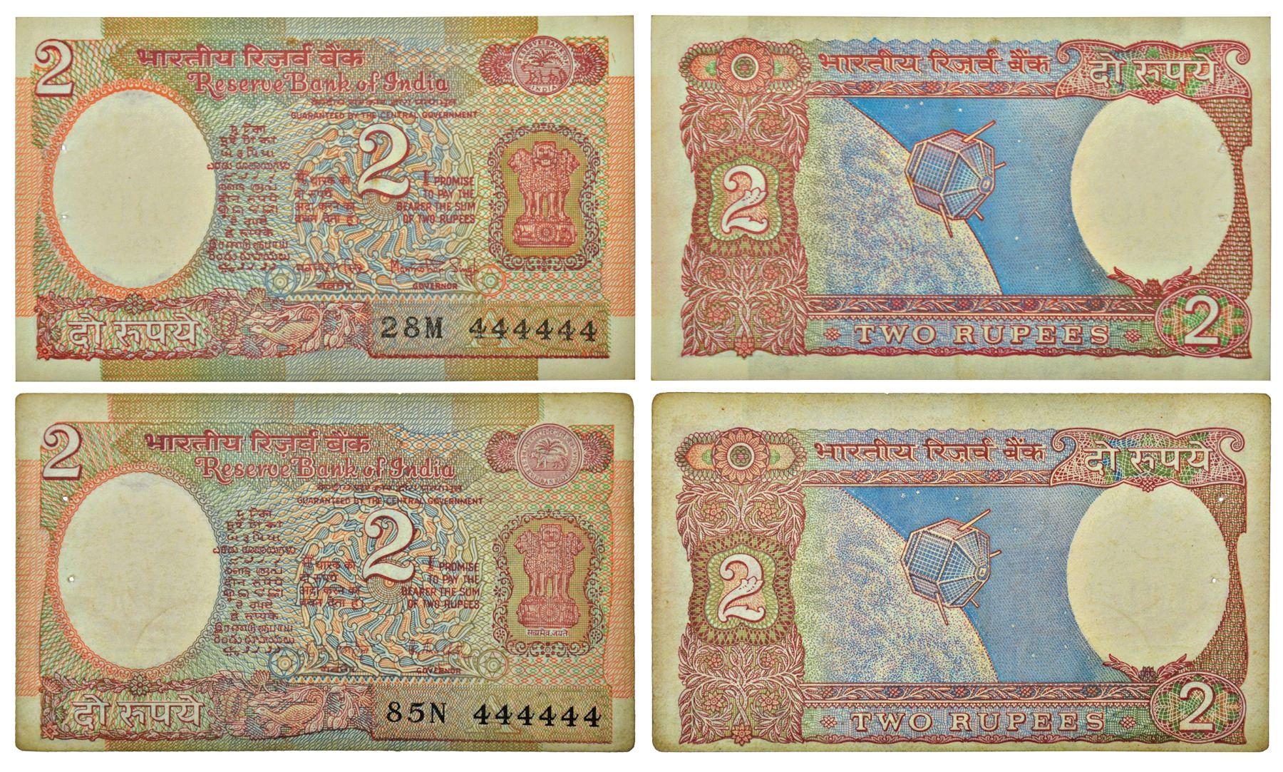 2 rupees, fancy number notes (2), Aryabhatta series, ND, signed by Manmohan Singh and R.N. Malhotra, Inset 'A', serial no.: 28M 444444, 85N 444444. (2 notes)