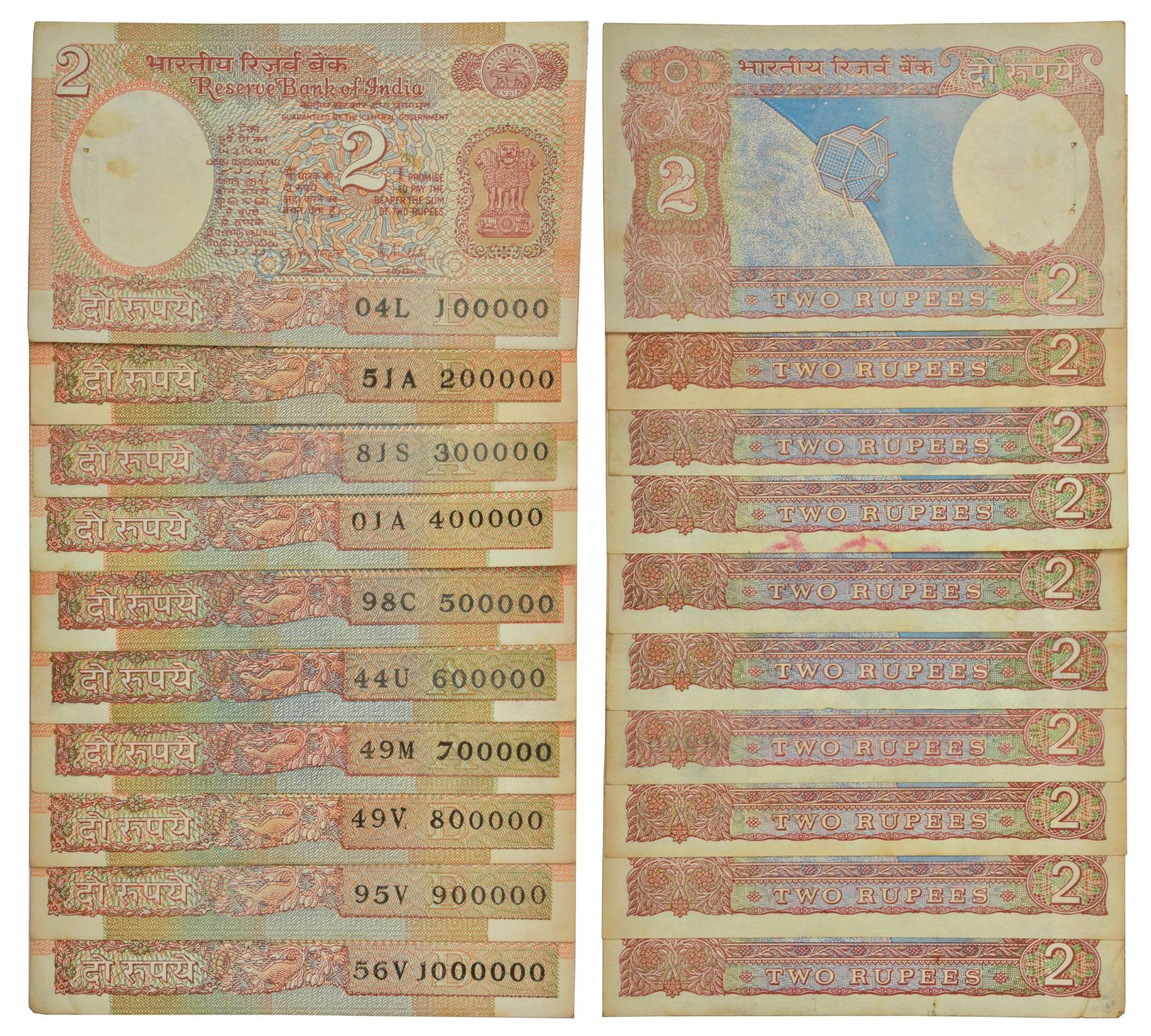 2 rupees, fancy number set of 10 notes, Aryabhatta series, serial no.: 100000 to 1000000, serial no.: 200000 signed by S. Venkitaramanan, rest notes signed by R.N. Malhotra, few notes have little stain. (10 notes)
