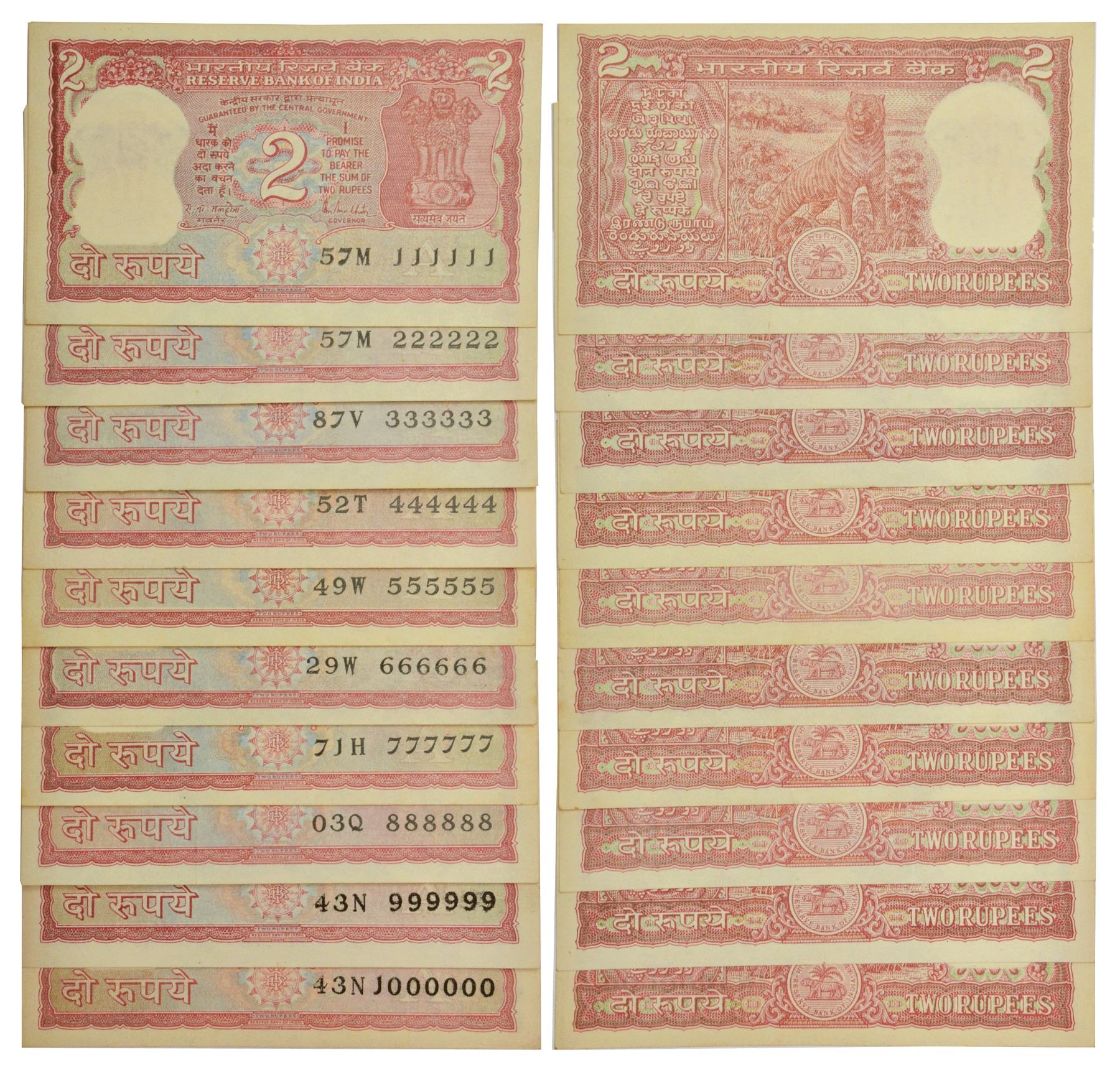 2 rupees, fancy number set of 10 notes, Tiger series, serial no.: 111111 to 1000000, 1x signed by Manmohan Singh- serial no. 888888 (has crease), rest all notes signed by R.N. Malhotra. (10 notes)