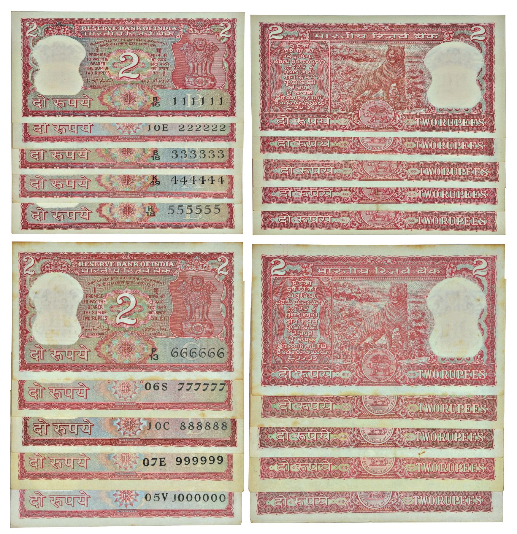 2 rupees, fancy number set of 10 notes, Tiger series, various Governor's signature and inset, serial no.: 111111 to 1000000. (10 notes)