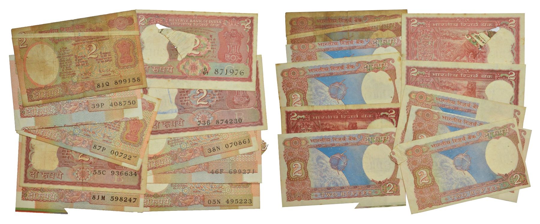 2 rupees, group of 10 misprint notes, 3x Tiger series and 7x Aryabhatta series, various governor's signature, various types of misprint, includes some part not printed, extra paper, crease, shifting error, etc. (10 notes)