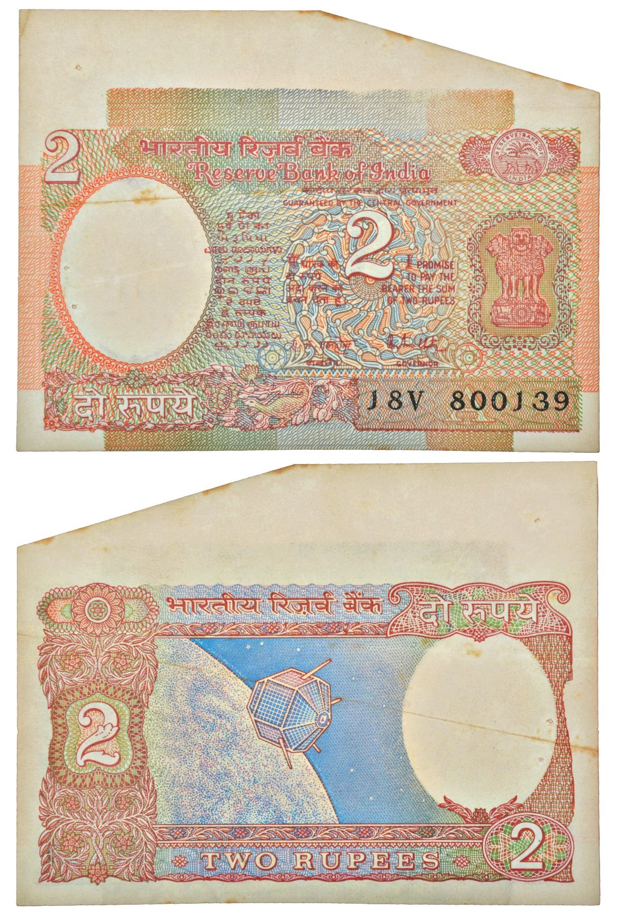 2 rupees, misprint, Aryabhatta series, ND (1985-1990), signed by R.N. Malhotra, inset 'A', serial no.: 18V 800139, extra paper on upper side margin.