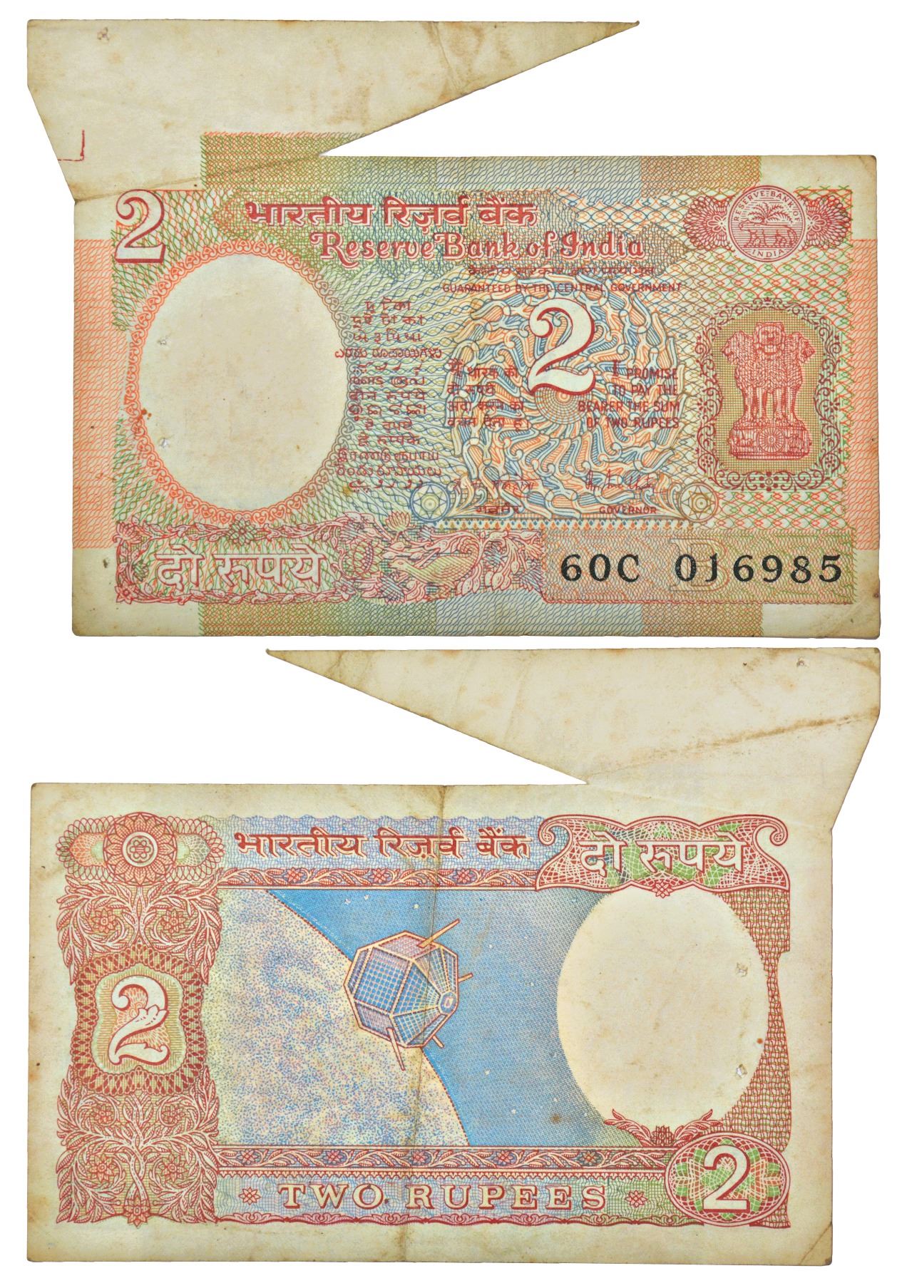 2 rupees, misprint, Aryabhatta series, ND (1985-1990), signed by R.N. Malhotra, inset 'B', serial no.: 60C 016985, extra paper on upper left corner.