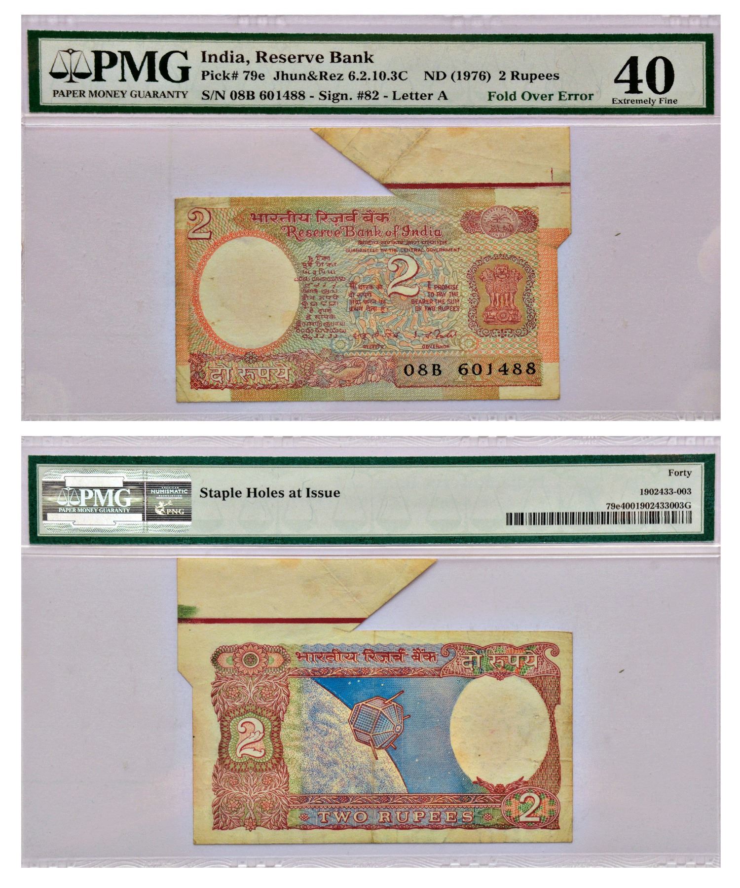 2 rupees, misprint, ND (1977-1982), signed by I. G. Patel, inset 'A', serial no.: 08B 601488, extra paper on upper right corner.