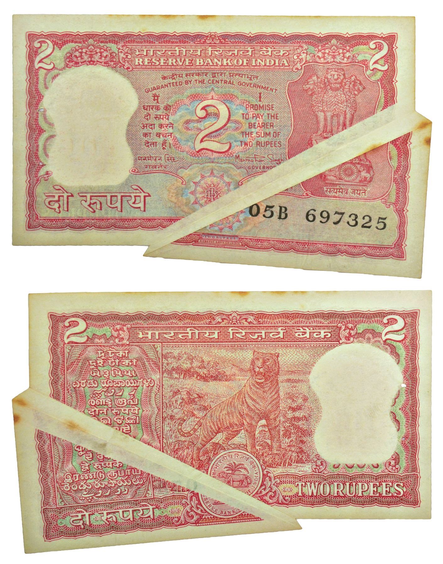 2 rupees, misprint, ND (1982-1985), tiger series, signed by Manmohan Singh, without inset, serial no.: 05B 697325, crease error on both sides.