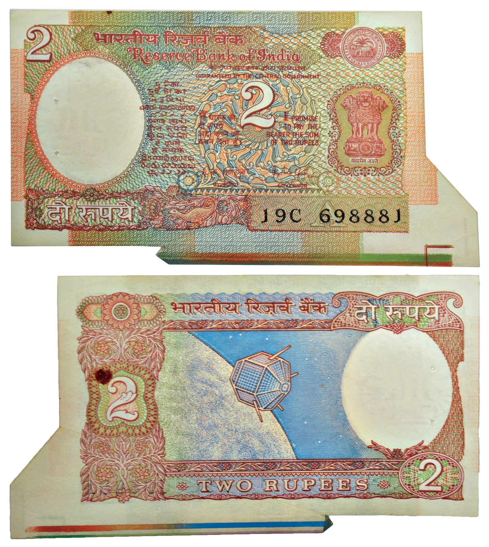 2 rupees, misprint, ND (1985-1990), aryabhatta series, signed by R.N. Malhotra, inset 'A', serial no.: 19C 698881, extra paper on lower right side, rubber mark on reverse.