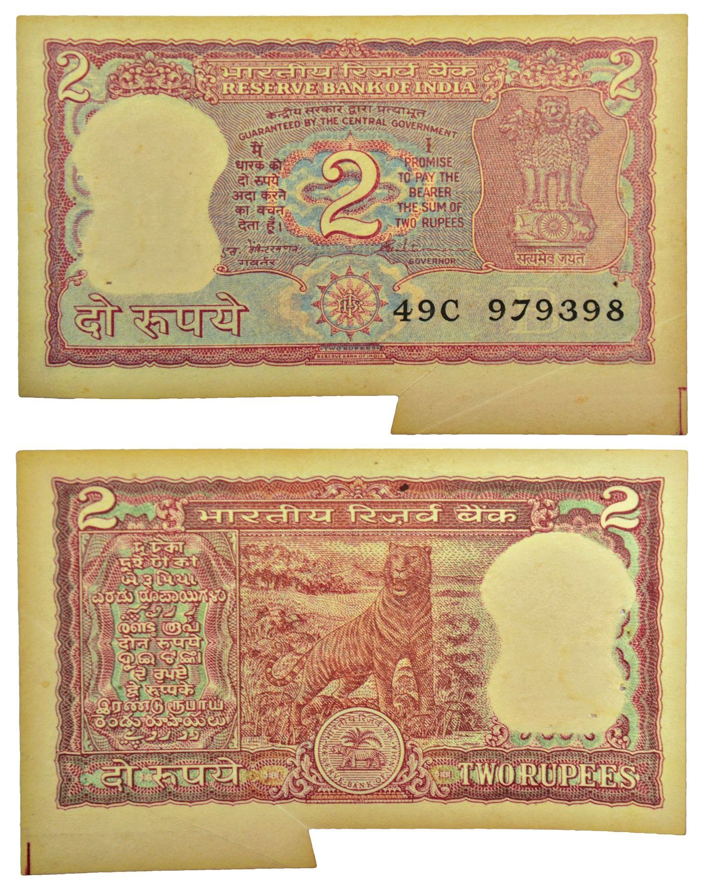 2 rupees, misprint, ND (1990-1992), tiger series, signed by S. Venkitaramanan, inset 'B', serial no.: 49C 979398, extra paper on lower right side.