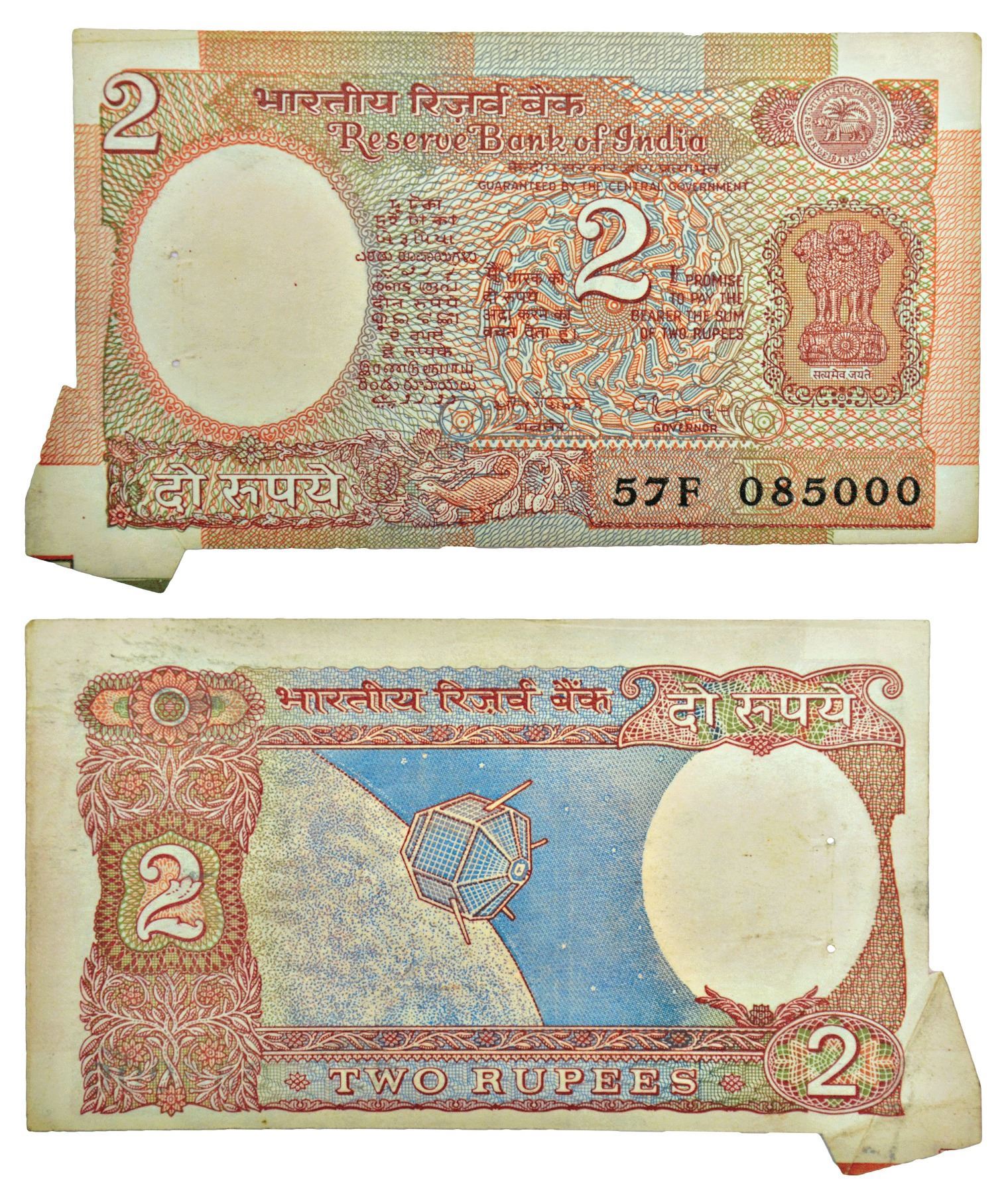 2 rupees, misprint, ND (1992-1997), aryabhatta series, signed by C. Rangarajan, inset 'B', serial no.: 57F 085000, extra paper on lower left corner.