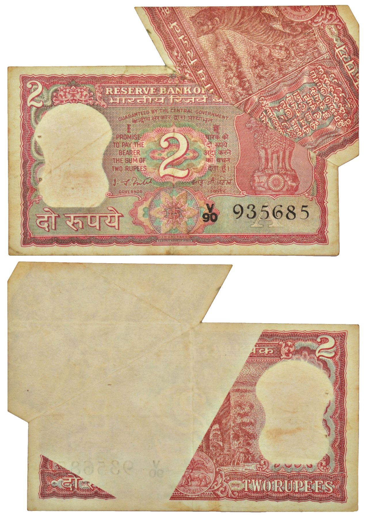 2 rupees, misprint, Tiger series, ND (1977-1982), signed by I.G. Patel, inset 'A', serial no.: V90 935685, flip error on reverse.