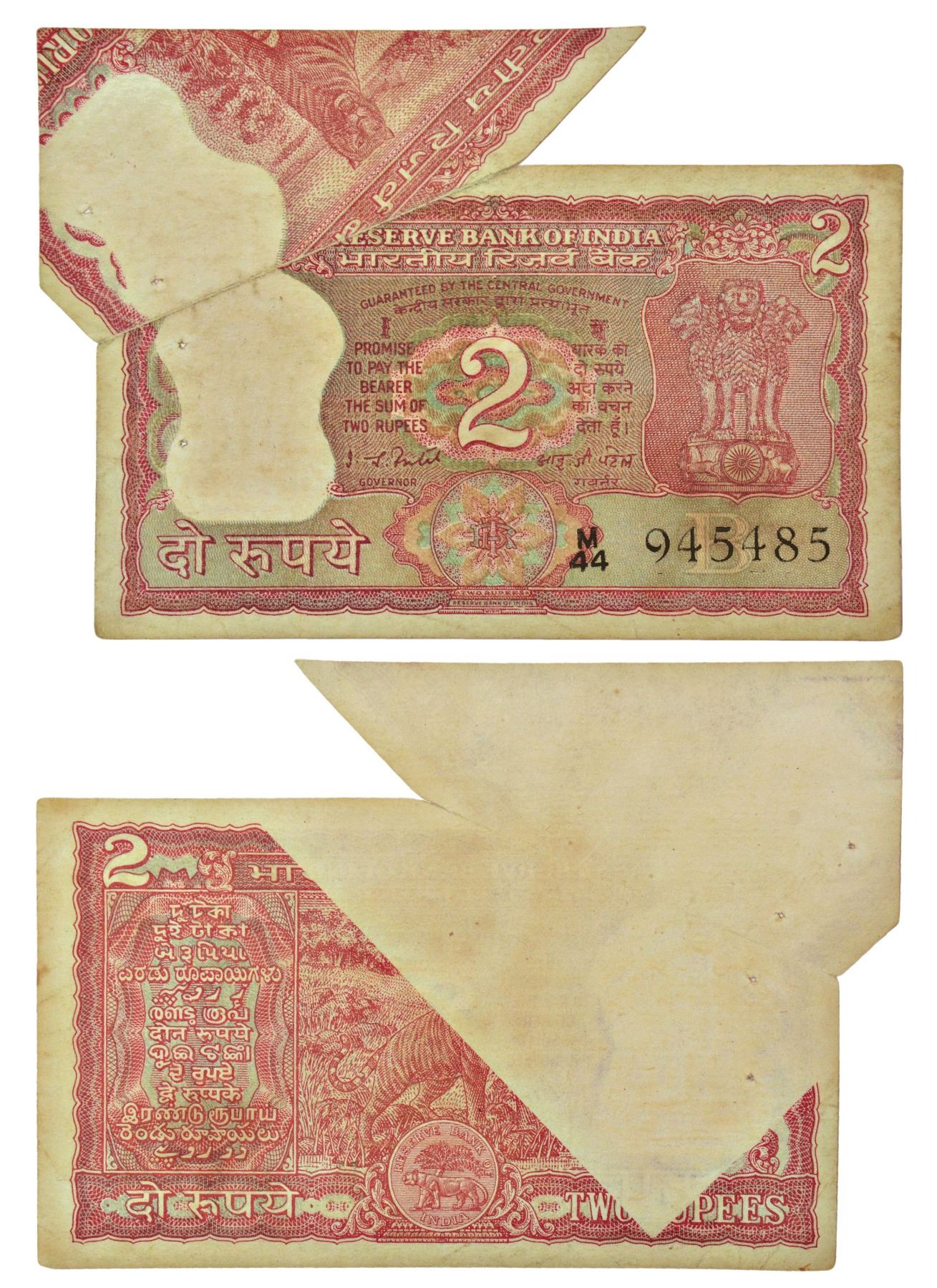 2 rupees, misprint, Tiger series, ND (1977-82), signed by I.G. Patel, inset 'B', serial no.: M44 945485, flip error and some part not printed on reverse.