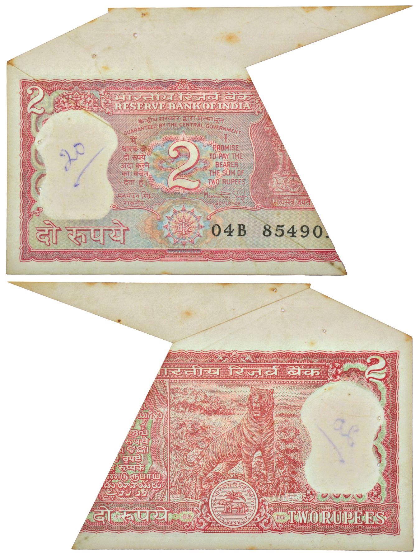 2 rupees, misprint, Tiger series, ND (1982-1985), signed by Manmohan Singh, without inset, serial no.: 04B 85490X, misaligned cutting, part of the sheet error.