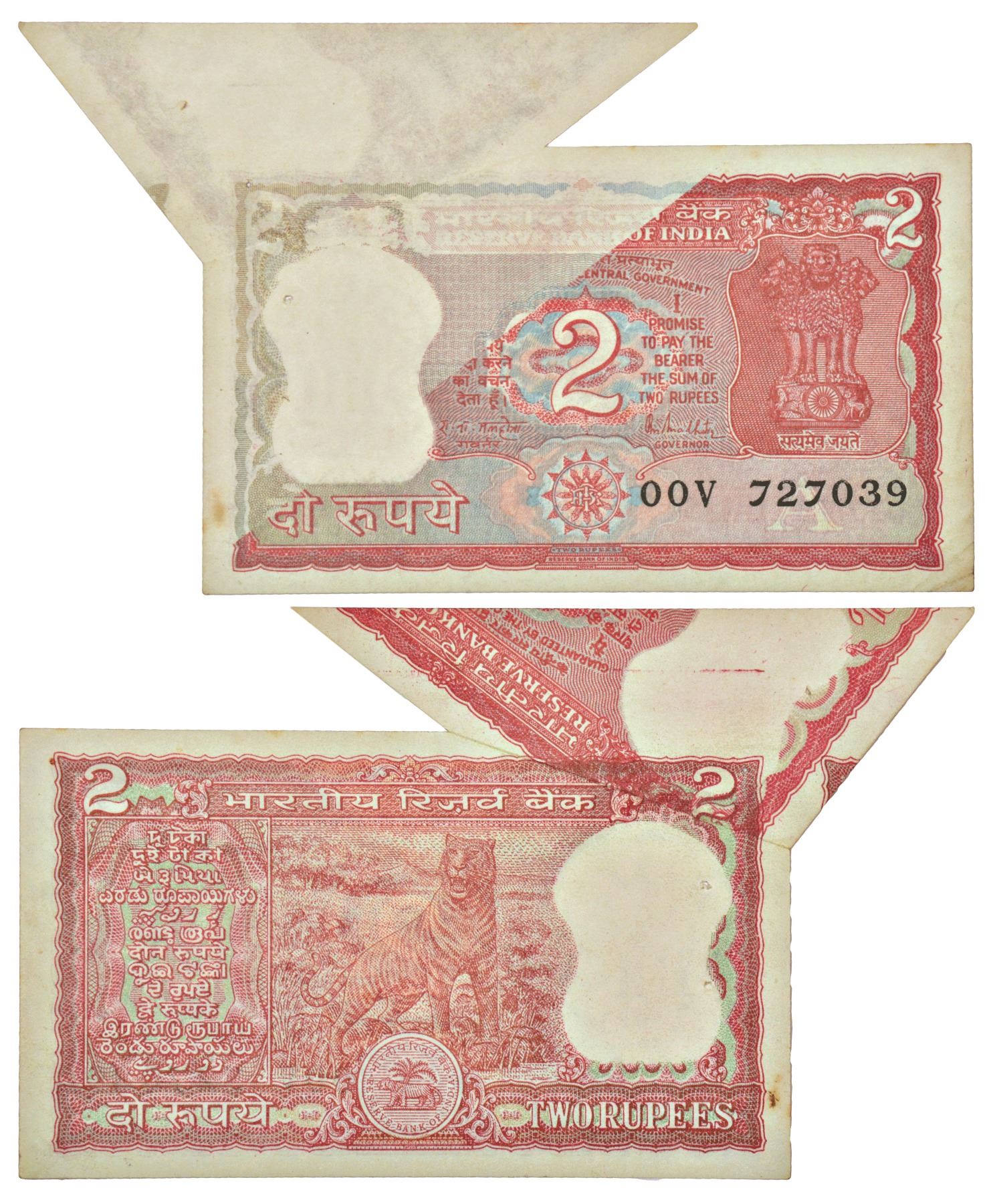 2 rupees, misprint, Tiger series, ND (1985-1990), signed by R.N. Malhotra, inset 'A', serial no.: 00V 727039, flip error on obverse.