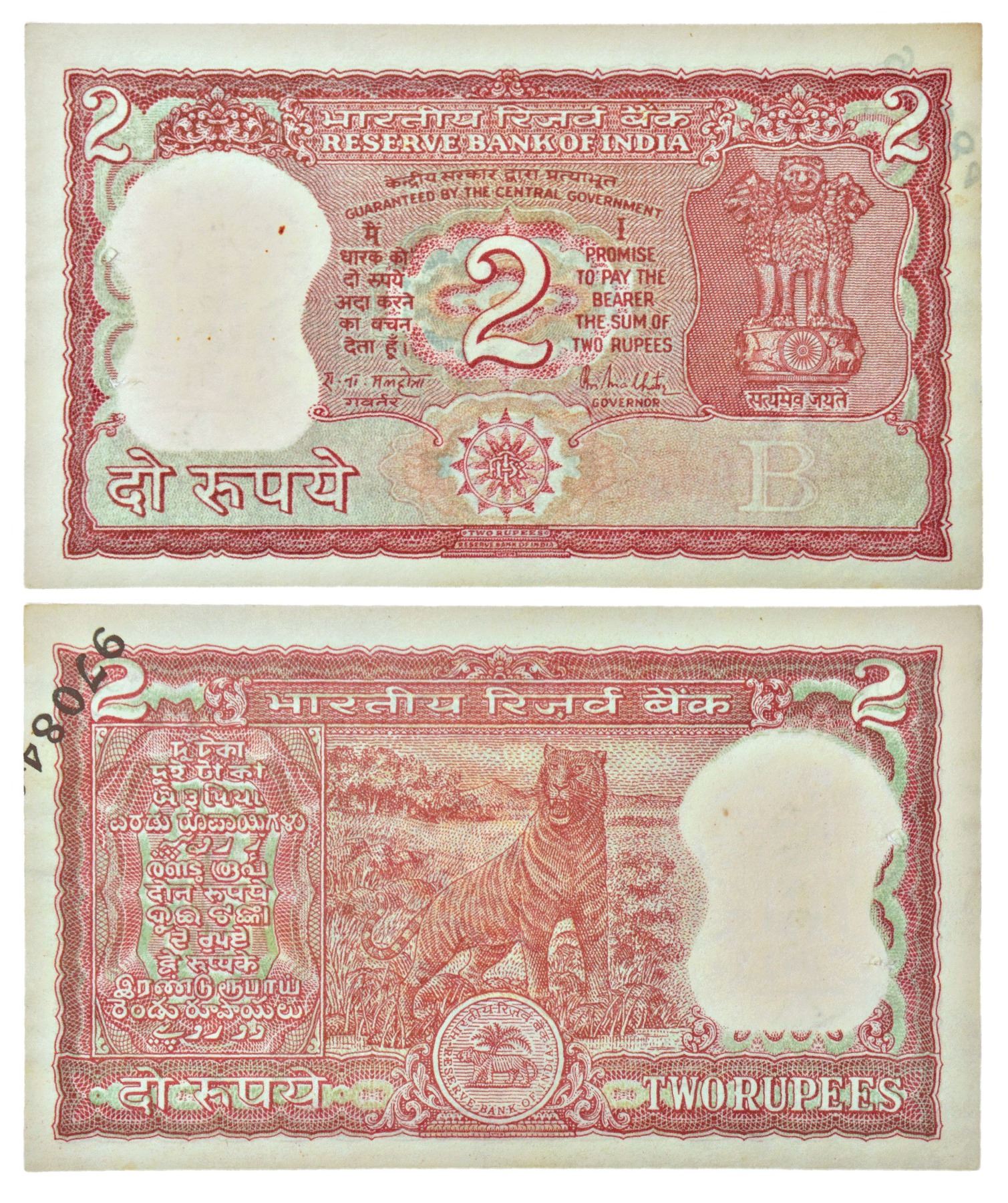 2 rupees, misprint, Tiger series, ND (1985-90), signed by R.N. Malhotra, inset 'B', without serial number on obverse and serial no.: 94084 printed on reverse.