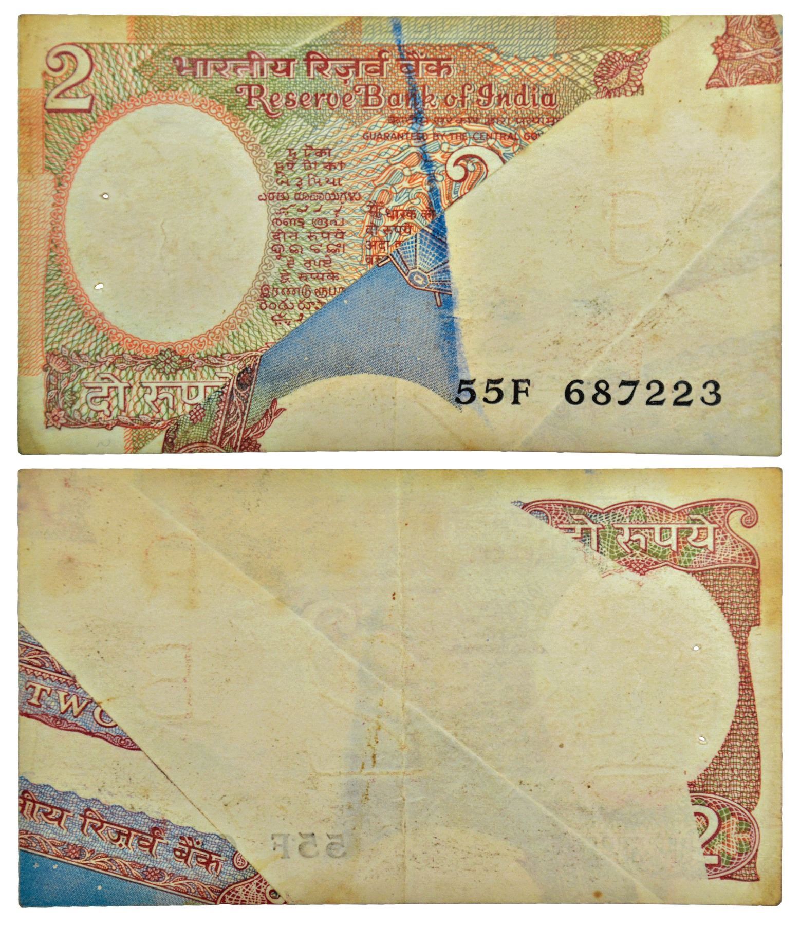 2 rupees, misprint, aryabhatta series, unsigned, serial no.: 55F 687223, most of the parts not printed on both sides and lower left part has additional printing on reverse.
