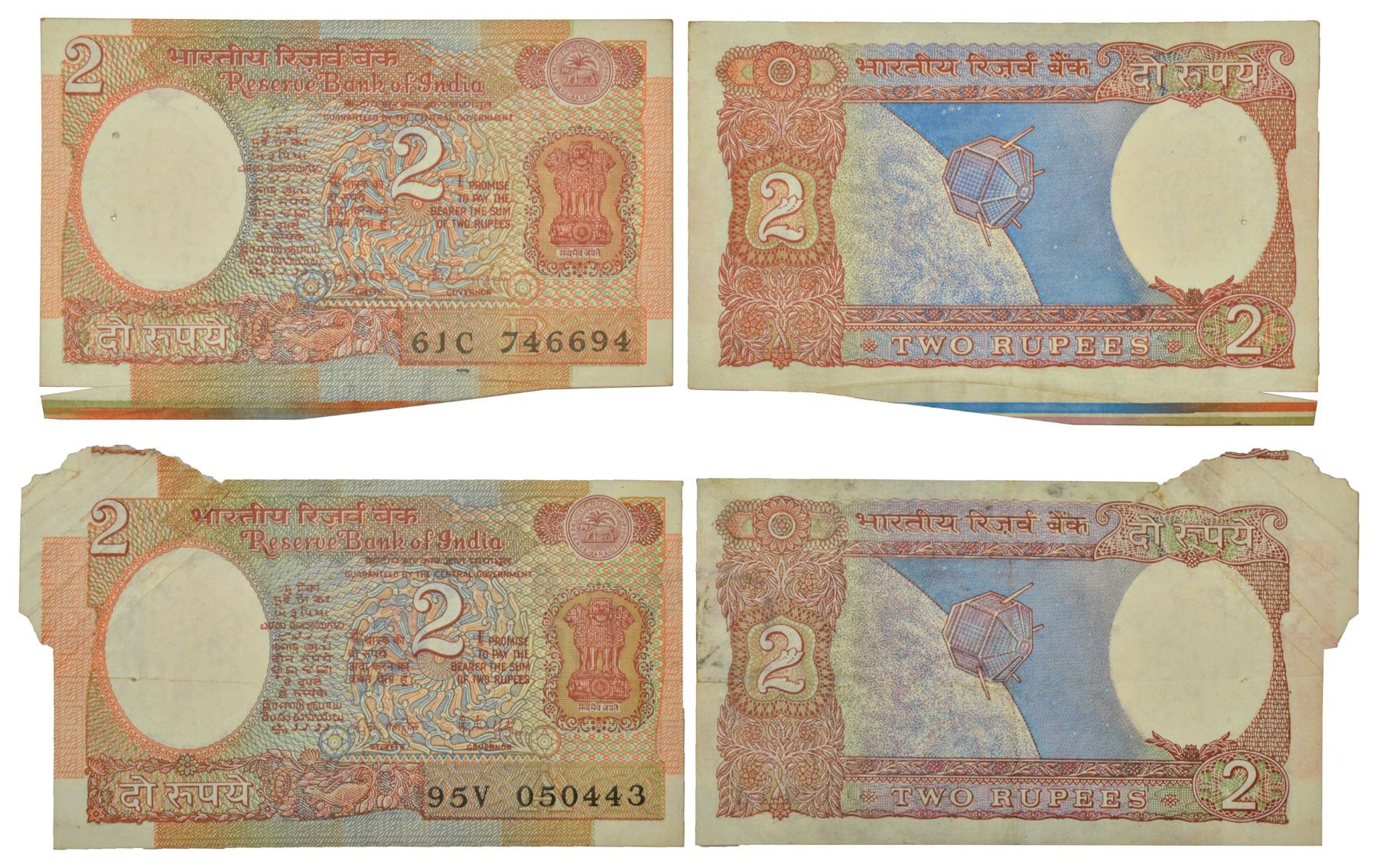 2 rupees, misprint notes (2), Aryabhatta series, ND, 1x signed by R.N. Malhotra, inset 'A', serial no.: 95V 050443; and 1x signed by S. Venkitaramanan, inset 'B', serial no.: 61C 746694, both notes have extra paper. (2 notes)