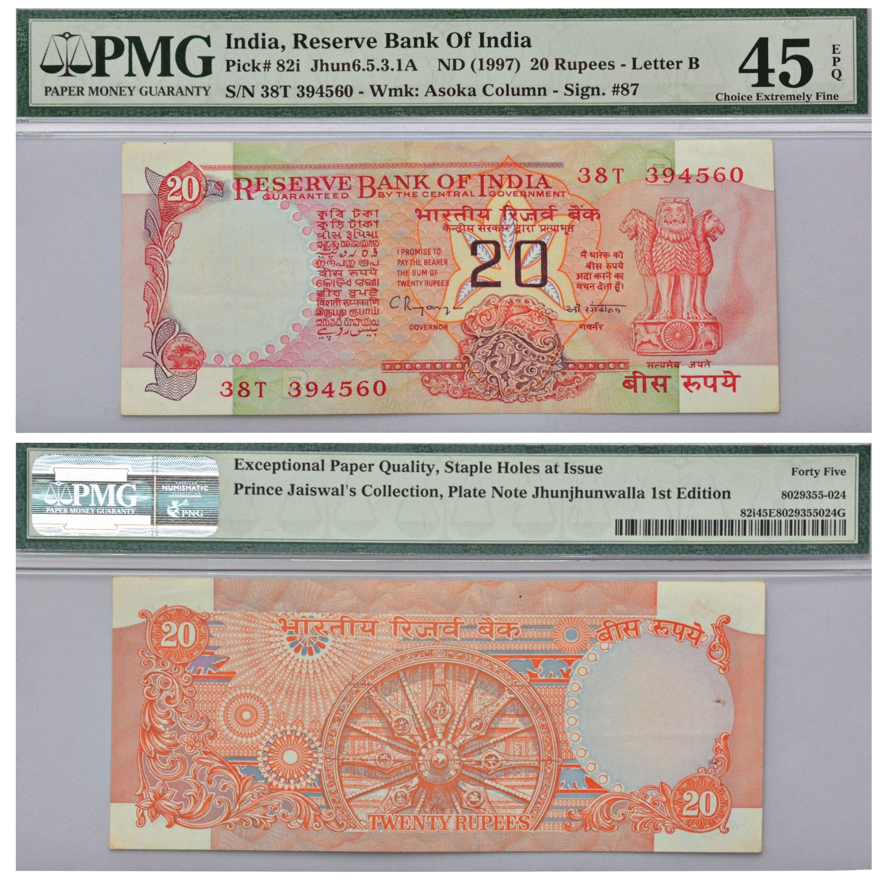 20 rupees, Wheel series, ND (1992-1997 AD), signed by C. Rangarajan, inset 'B', serial no.: 38T 394560, J&R 6.5.3.1A, plate specimen note of Jhunjhunwala 1st edition (1997).