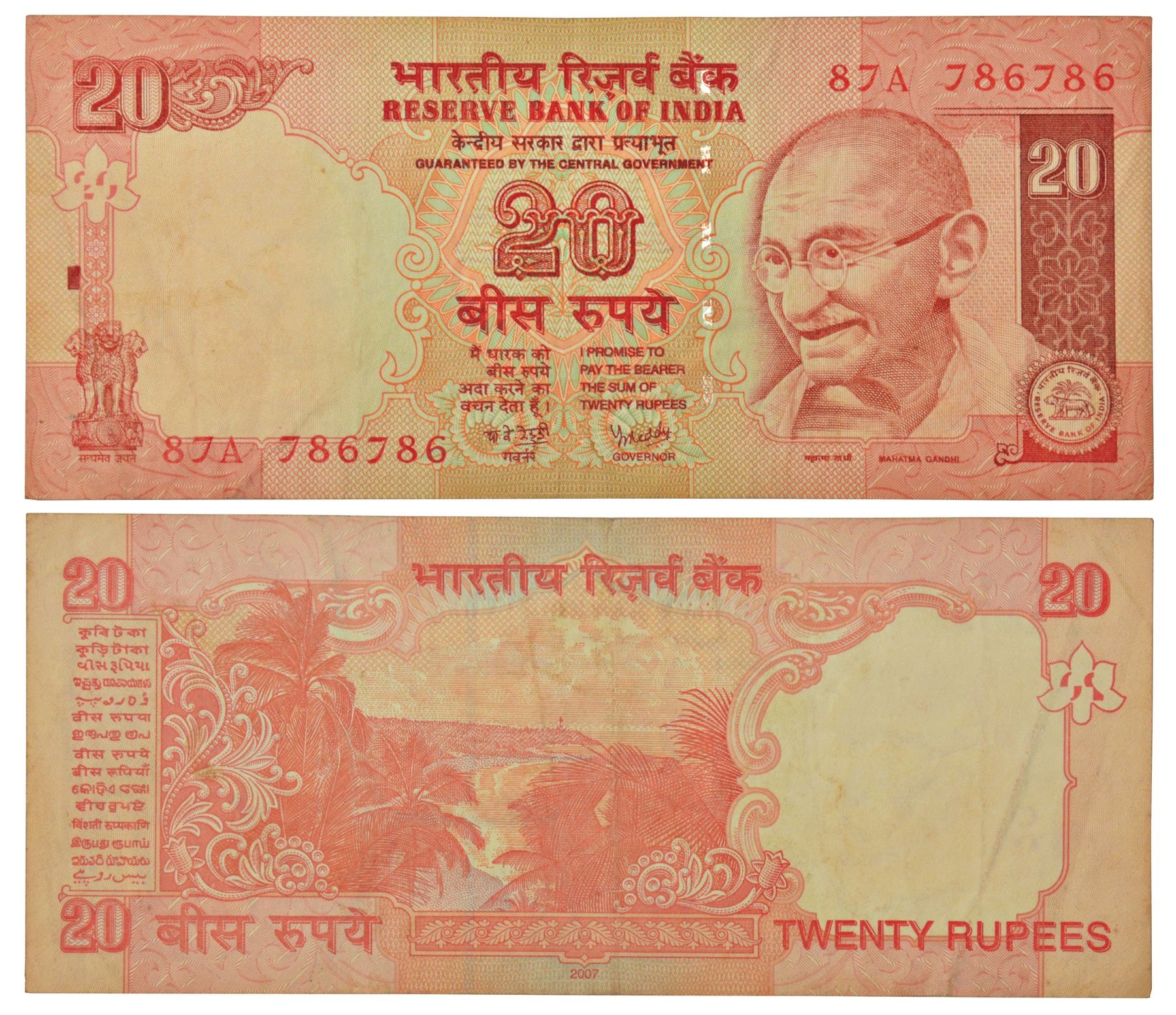 20 rupees, fancy number, Gandhi series, 2007, signed by Y. V. Reddy, without inset, serial no.: 87A 786786, J&R 6.5.5.1B.