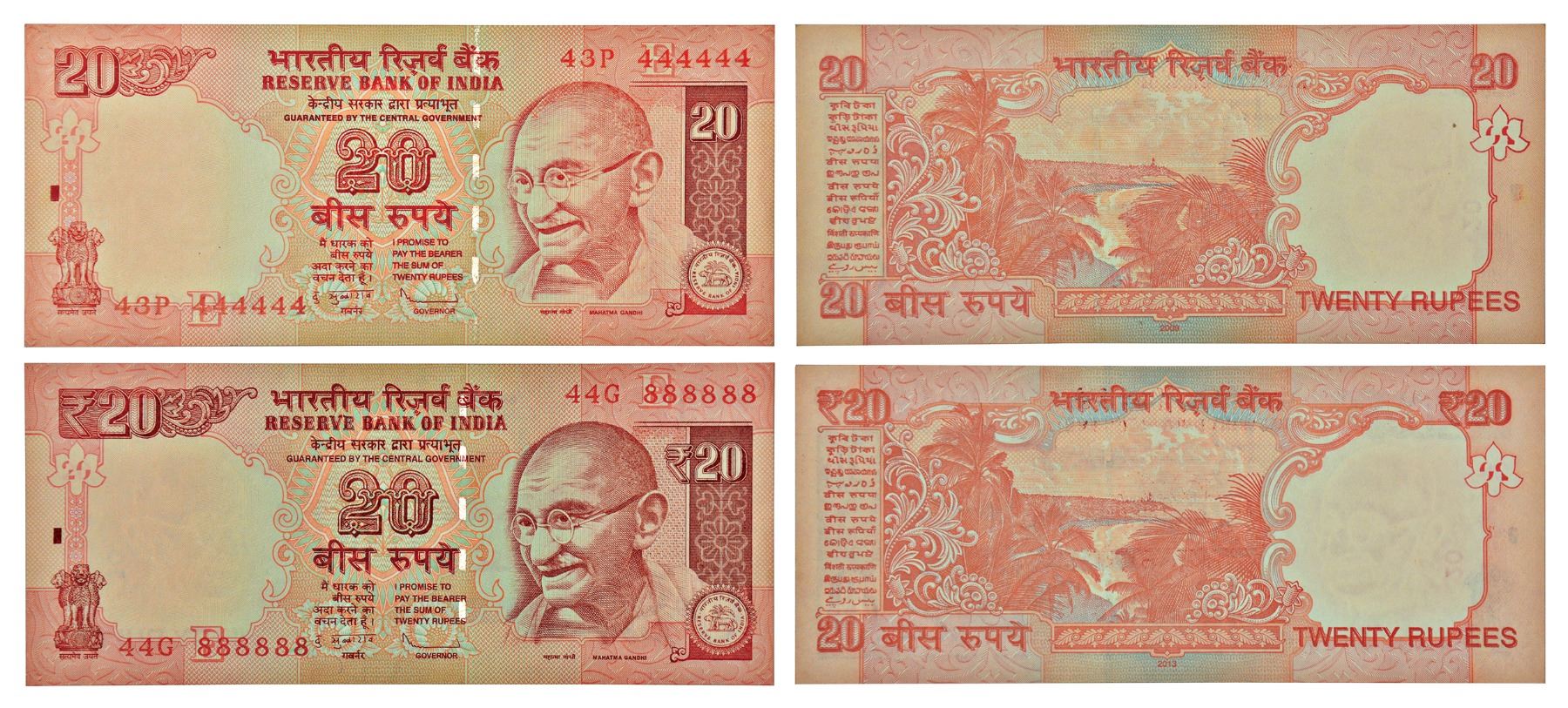 20 rupees, fancy number, Gandhi series, 2009 and 2013, signed by D. Subbarao, inset 'E', serial no.: 43P 444444, 44G 888888. J&R 6.5.5.2B. (2 notes)