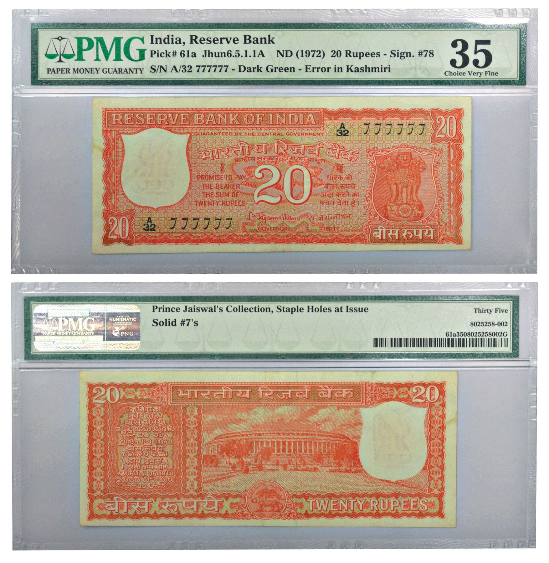 20 rupees, fancy number, ND (1972), signed by S. Jagannathan, without inset, serial no.: A32 777777.