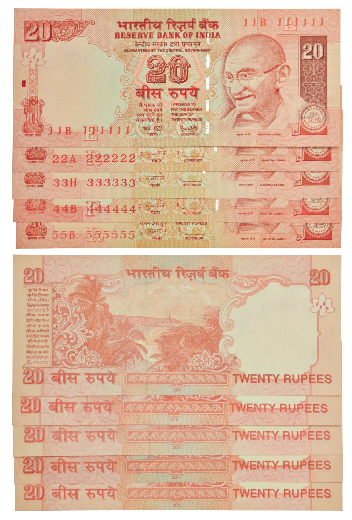 20 rupees, fancy number notes (5), Gandhi series, 1x 2007, signed by Y.V. Reddy, inset 'E', serial no.: 11B 111111 and 4x signed by D. Subbarao - 1x 2011, inset 'F', serial no.: 44B 444444; 2x 2012, inset 'R', serial no.: 22A 222222, 55B 555555 & 1x 2013, without inset, serial no.: 33H 333333, all notes are super fancy. (5 notes)