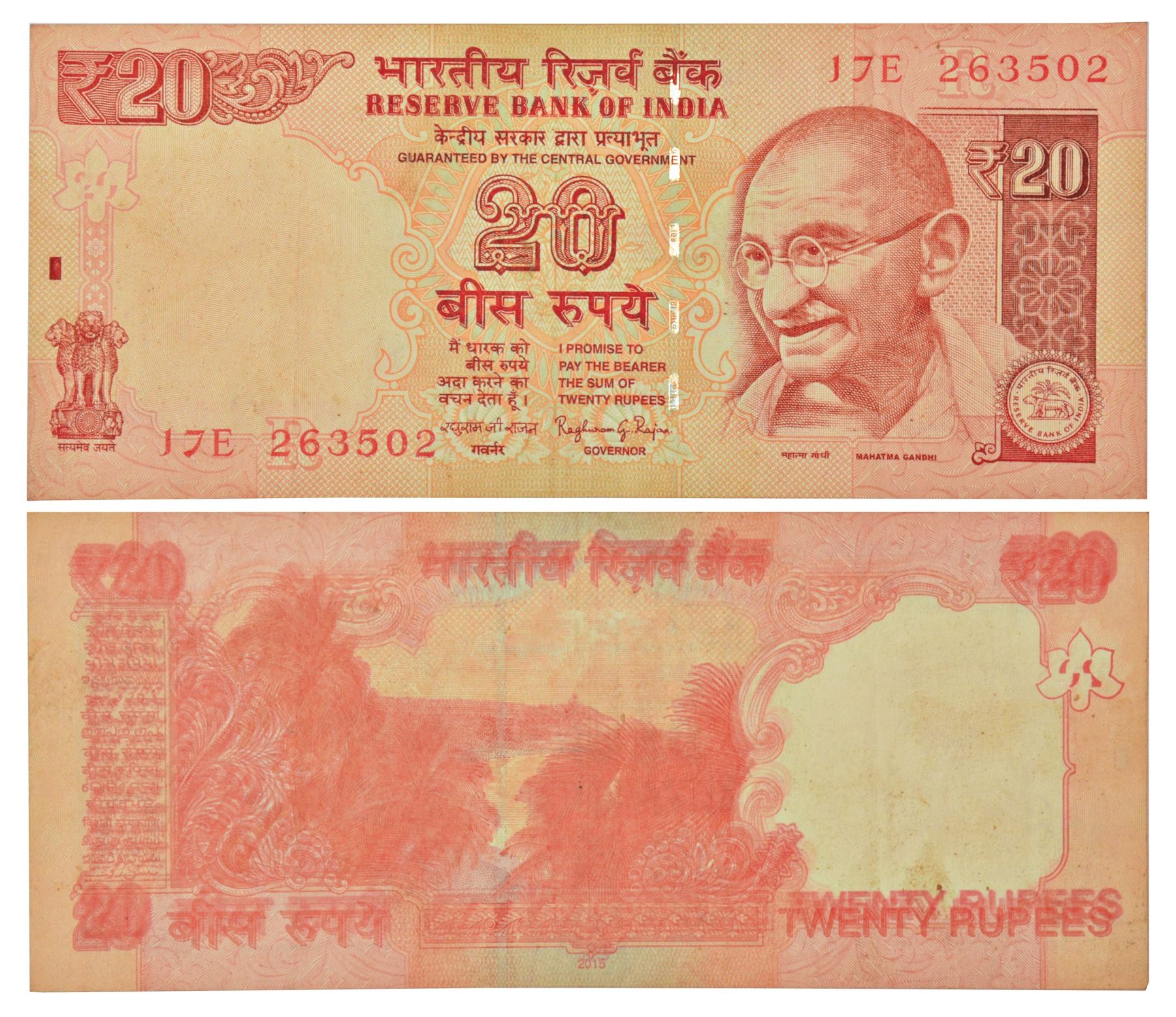20 rupees, misprint, Gandhi series, 2015, signed by Raghuram Rajan, inset 'R', serial no.: 17E 263502, die-slip (double print) on reverse.