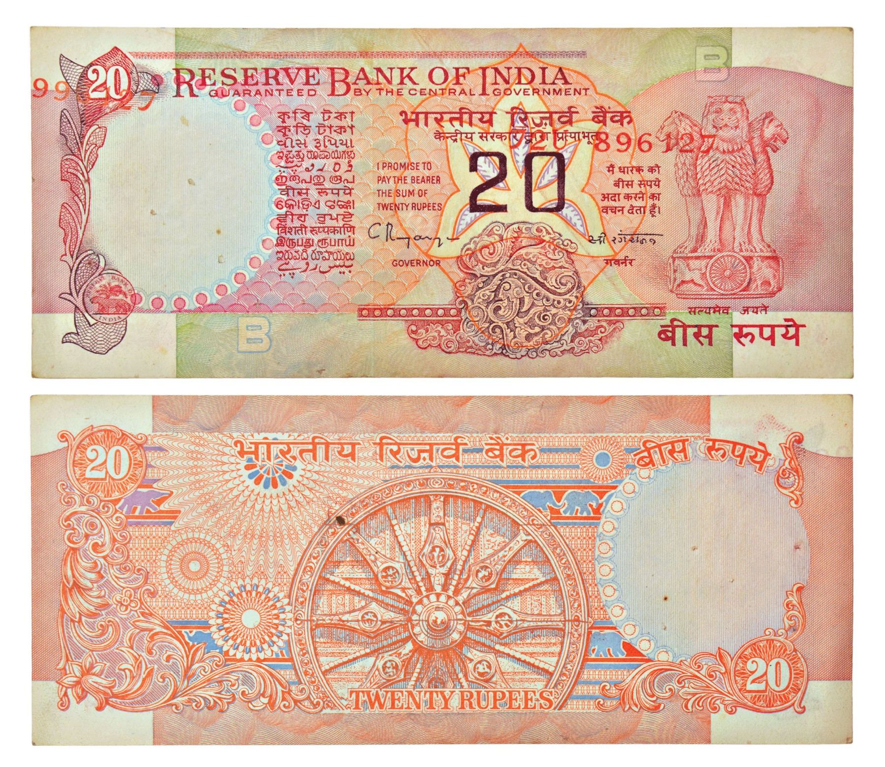 Paper Money: 20 rupees, misprint, Wheel series, ND (1992-1997), signed by C. Rangarajan, inset 'B',