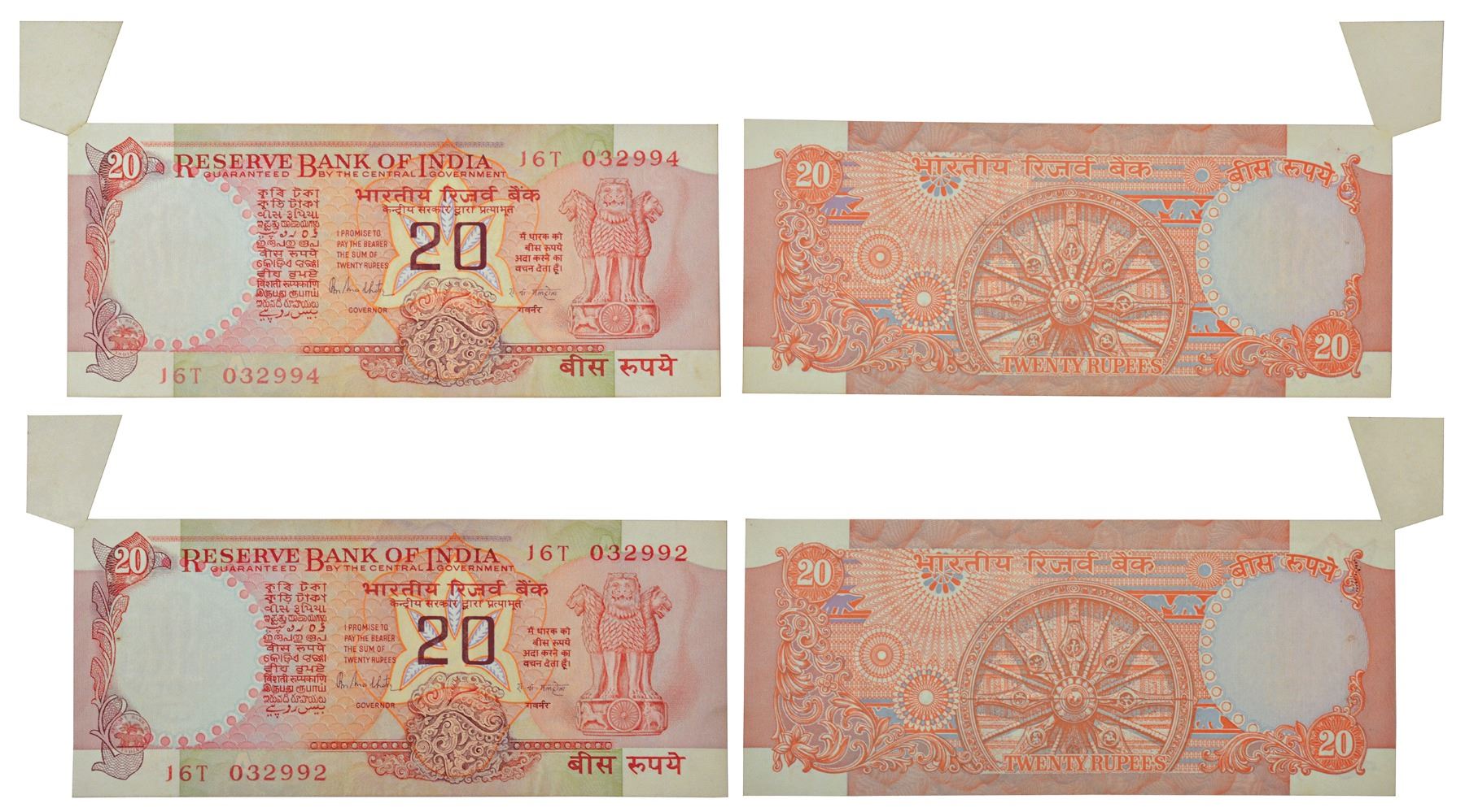 20 rupees, misprint notes (2), Wheel series, ND (1985-1990), signed by R.N. Malhotra, inset 'A', serial no.: 16T 032992 and 16T 032994, both notes have extra paper on upper left corner. (2 notes)