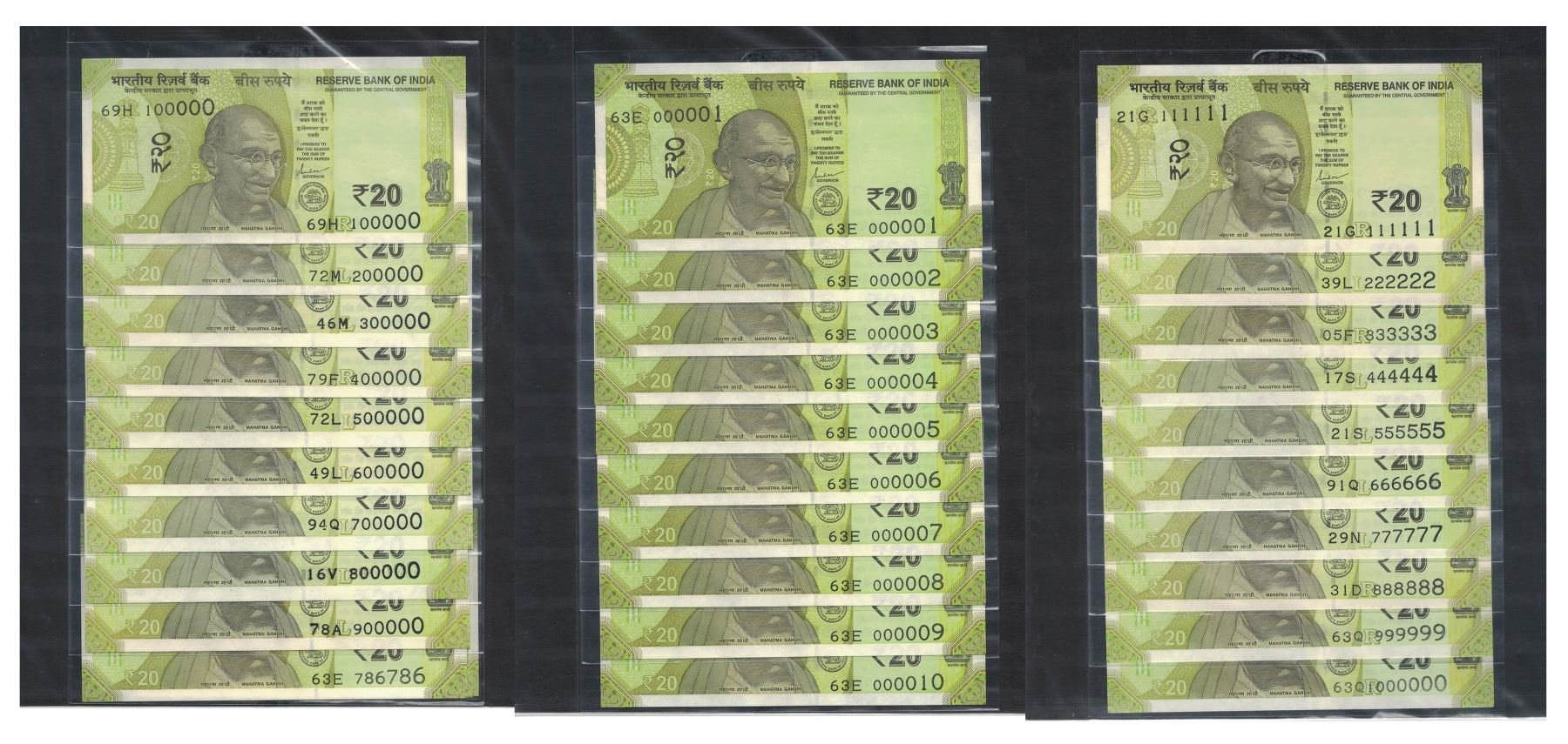 20 rupees, set of 32 fancy number notes, new Gandhi series, signed by Shaktikanta Das, telescopic serial no.: 000001 to 000010; 111111 to 999999; 100000 to 1000000; 000786; 786000 and 786786. (32 notes)