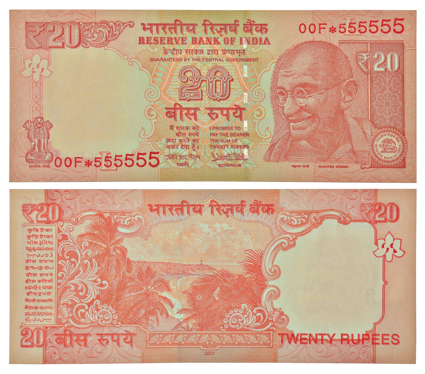 20 rupees, star fancy number, Gandhi series, 2017, signed by Urjit R. Patel, inset 'L', serial no.: 00F*555555.