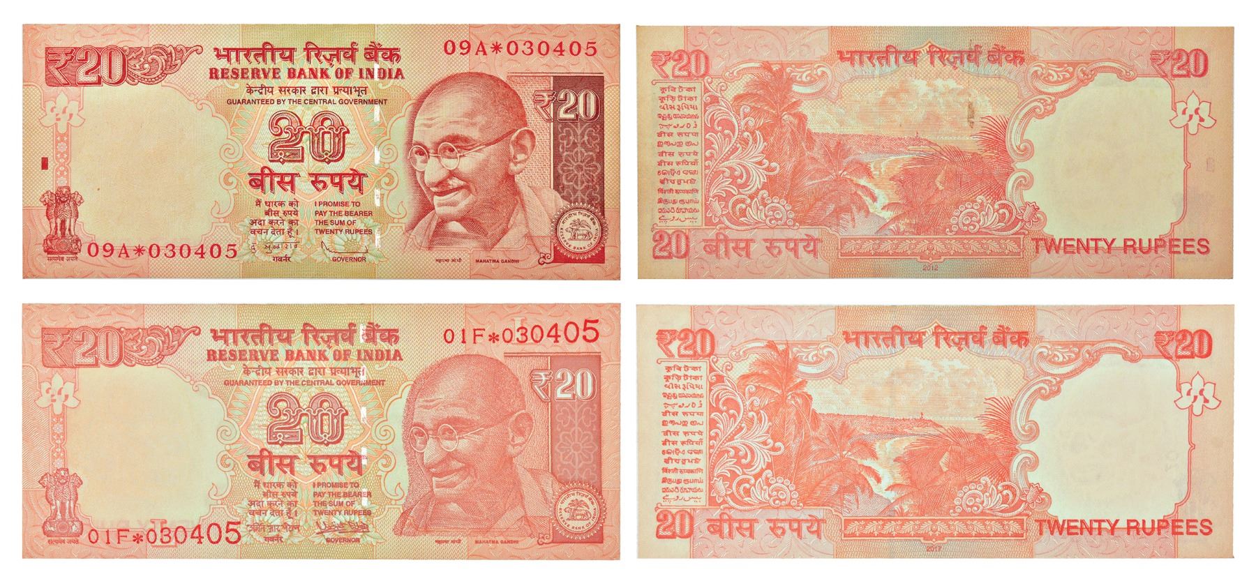 20 rupees, star notes (2), Gandhi series, 1x 2012, signed by D. Subbarao, without inset, ascending serial no.: 09A*030405 and 1x 2017, signed by Urjit Patel, inset 'L', telescopic ascending serial no.: 01F*030405. Both notes have same serial number. (2 notes)