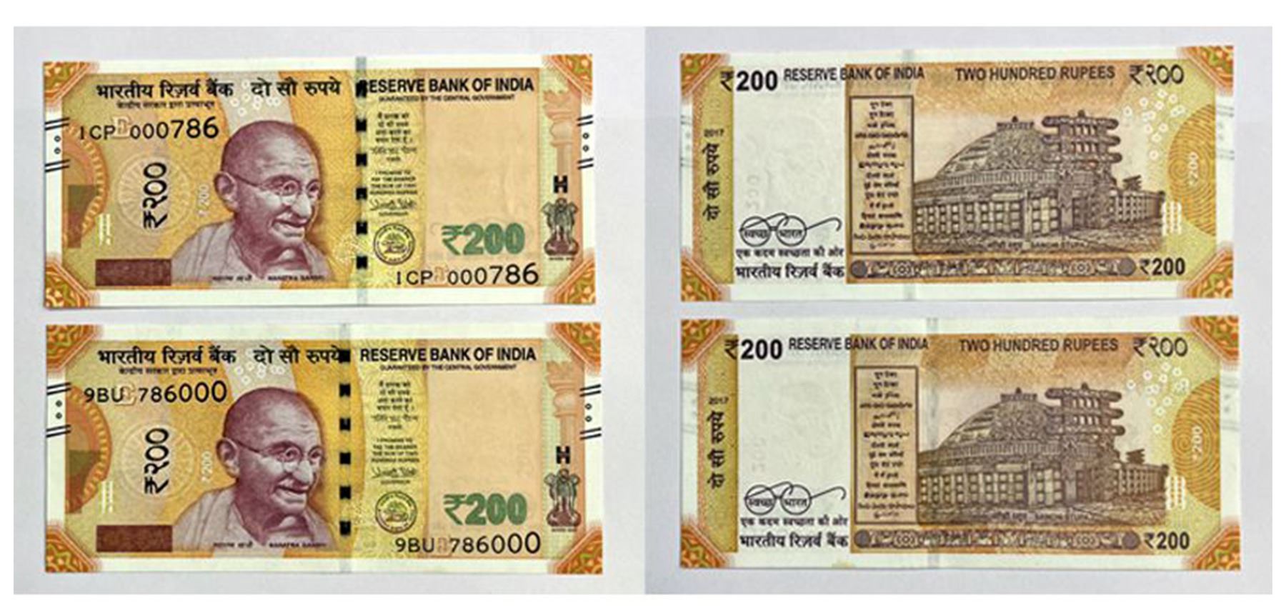 200 rupees (2), fancy number, new Gandhi series, 2017, signed by Urjit Patel, inset 'E', telescopic serial nos.: 1CP 000786 and 9BU 786000. (2 notes)