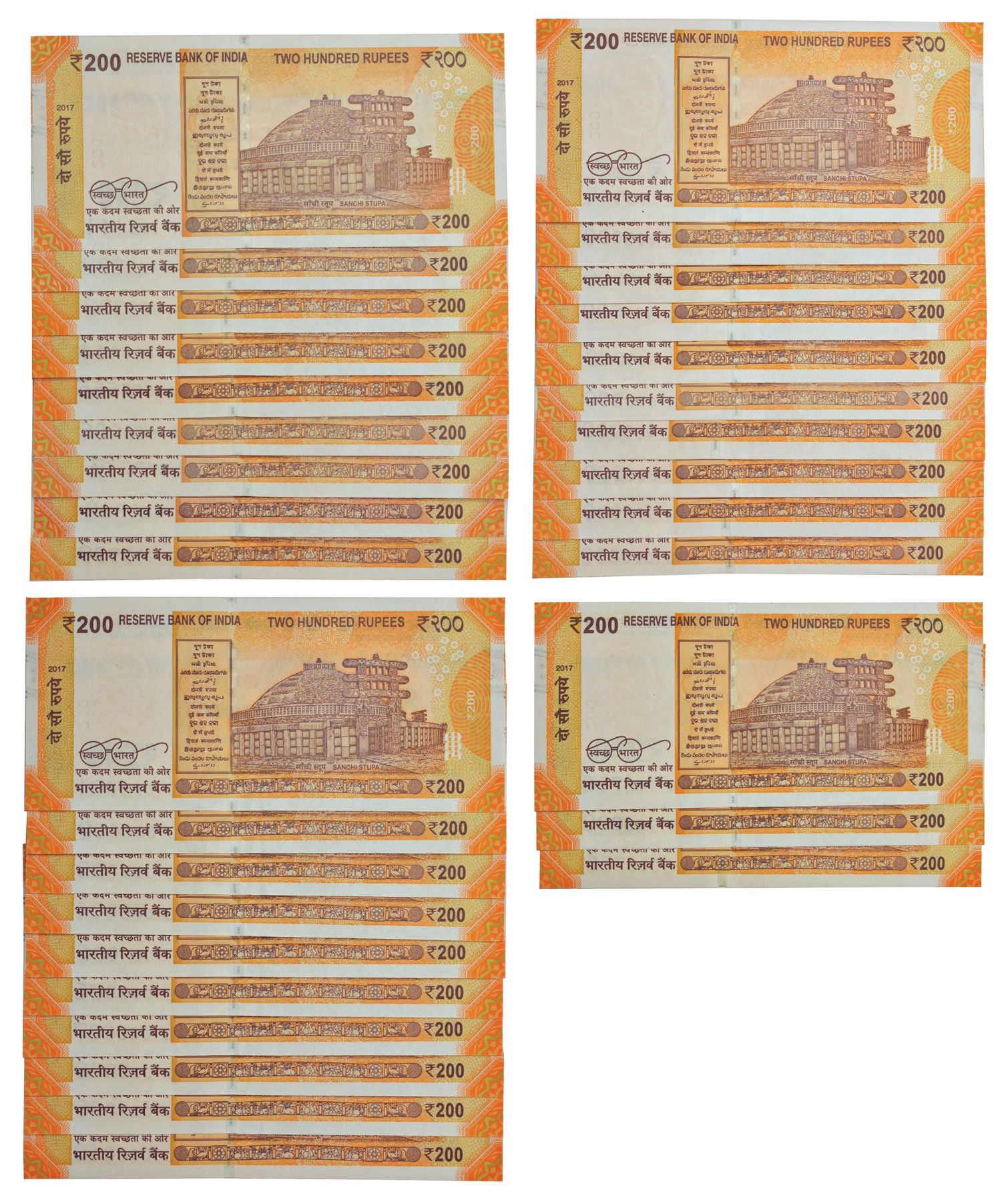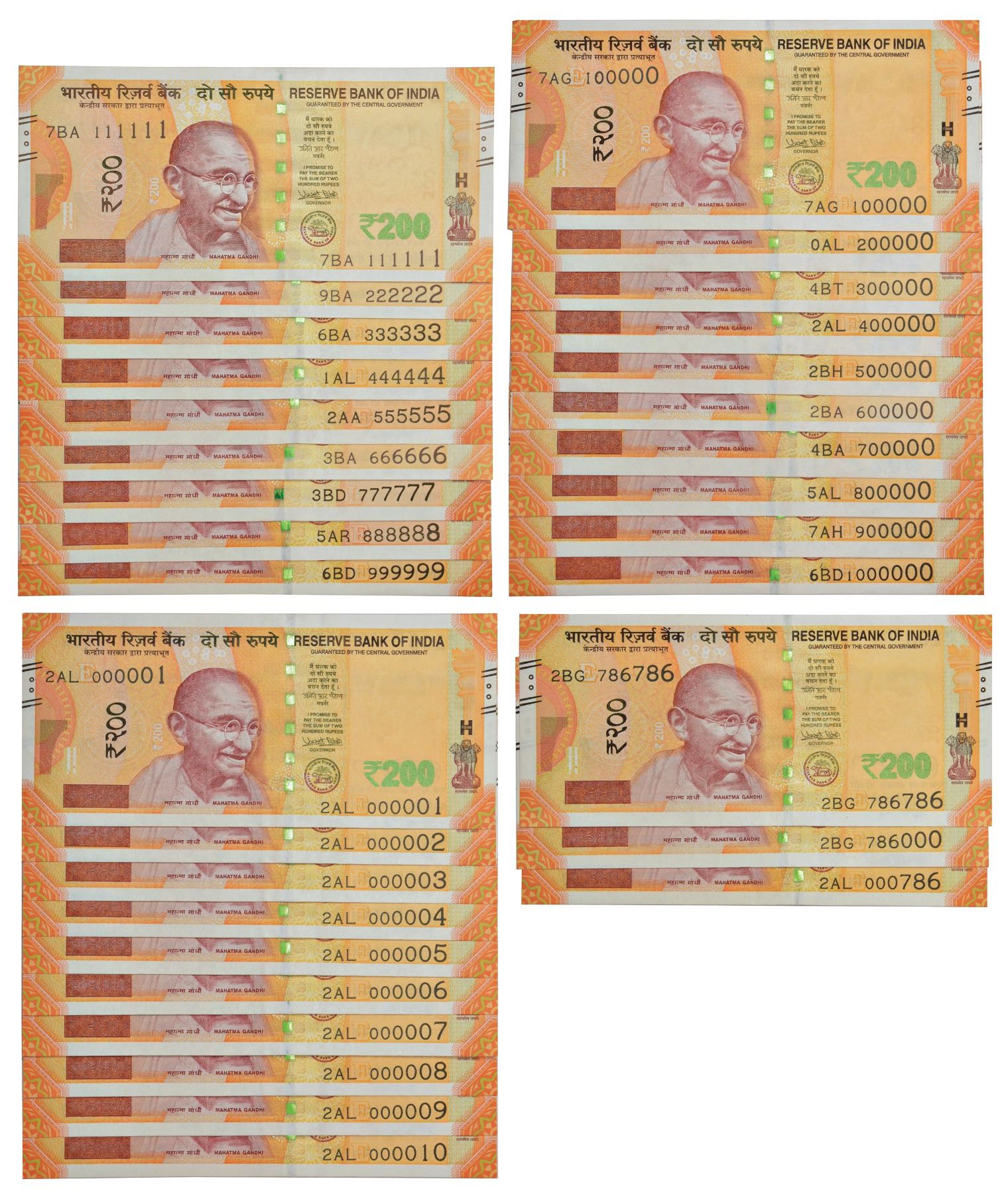 200 rupees, fancy number set of 32 notes, New Gandhi series, 2017, signed by Urjit Patel, various inset (mostly 'E'), Telescopic, serial no.: 111111 to 999999, 100000 to 1000000, 000001 to 000010, 000786, 786000 and 786786. (32 notes)