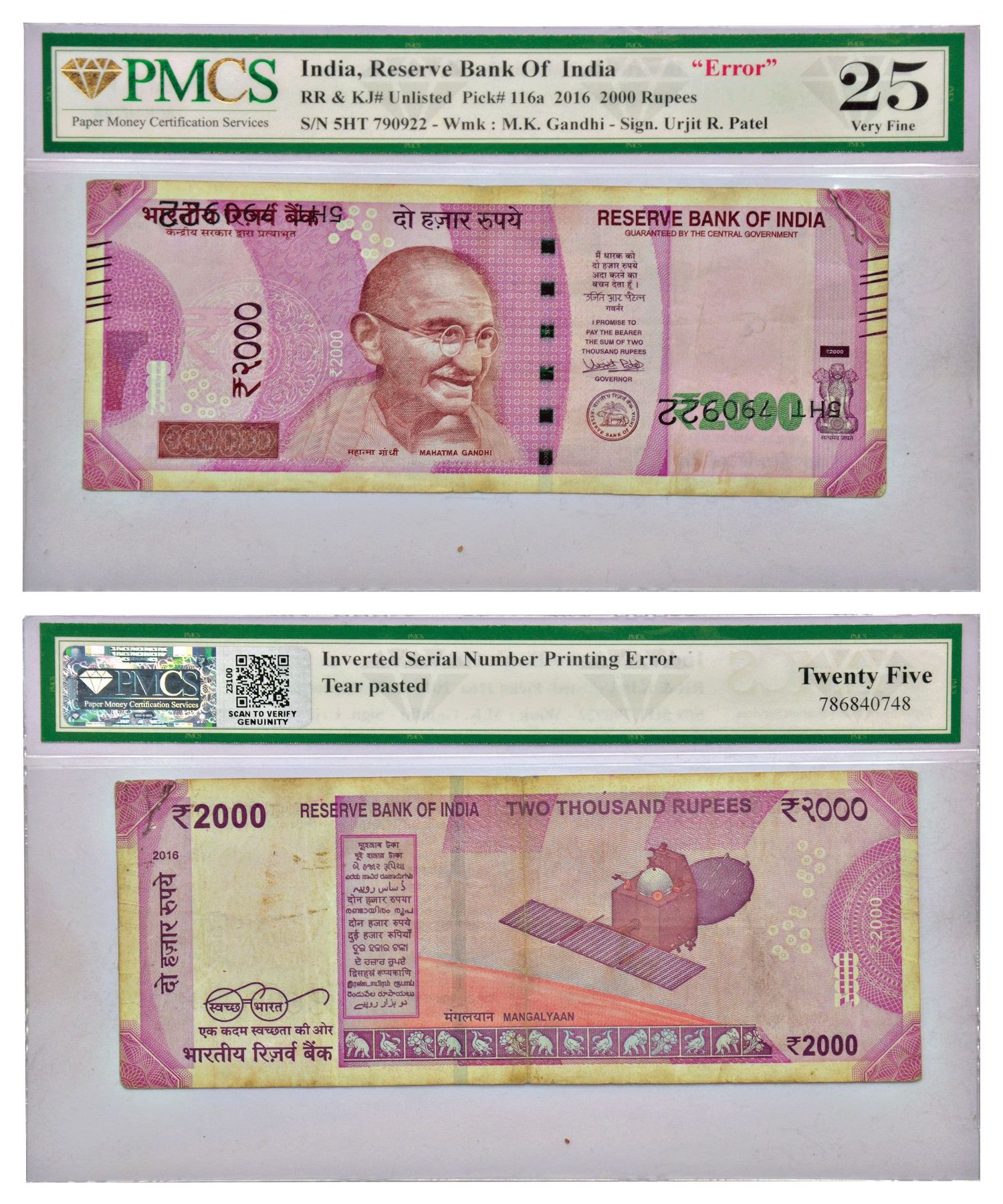 2000 rupees, misprint, Gandhi series, 2018, signed by Urjit Patel, without inset, serial no.: 5HT 790922, both serial number are inverted.