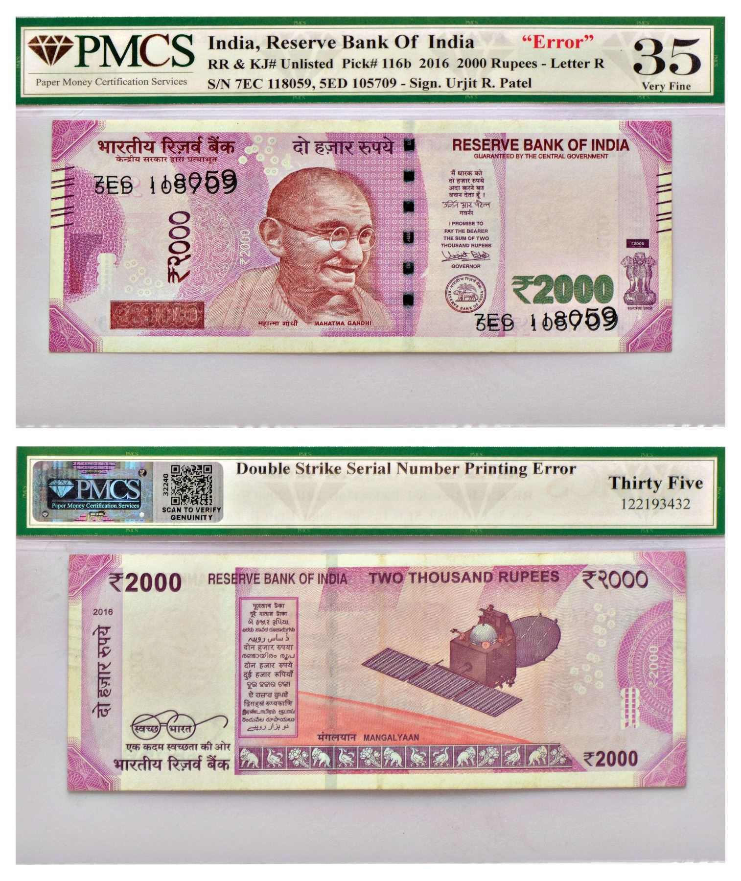 2000 rupees, misprint, new Gandhi series, 2016, signed by Urjit Patel, inset 'R', telescopic serial nos.: 7EC 118059 and 5ED 118059, serial number struck double on both sides.