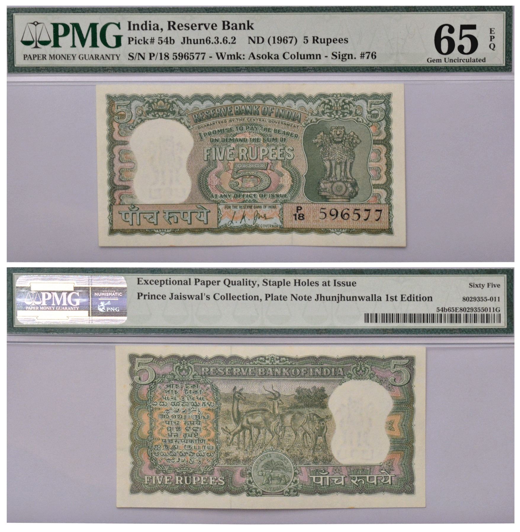 5 rupees, Black Buck series, ND (1967), signed by L.K. Jha, without inset, serial no.: P18 596577, J&R 6.3.6.2, plate specimen note of Jhunjhunwala 1st edition (1997).