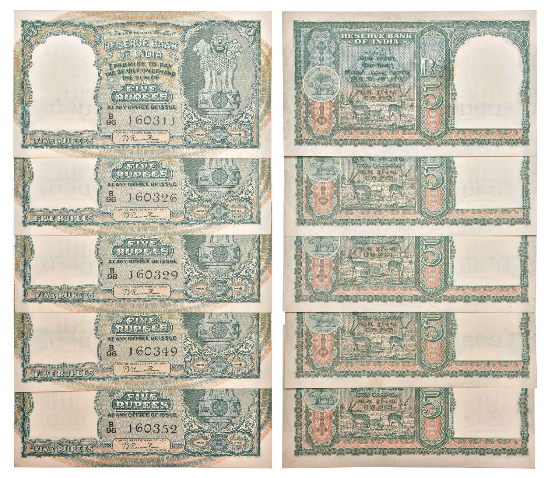 5 rupees, Black buck series notes (5), ND (1950), signed by B. Rama Rau, only English in center, all notes have B96 prefix, J&R 6.3.1.1. (5 notes)