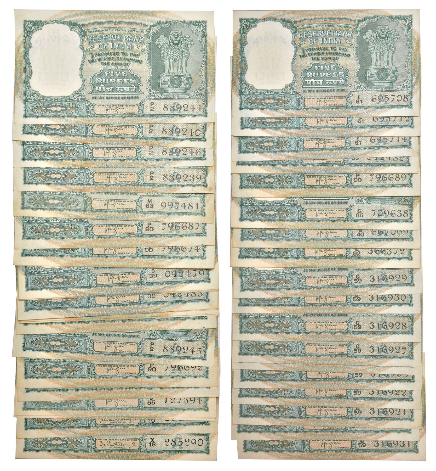 5 rupees, Black buck series notes (53), ND, 49x signed by H.V.R. Iengar, inset 'A', and 4x signed by P.C. Bhattacharya, inset 'A', various prefixes. (53 notes)