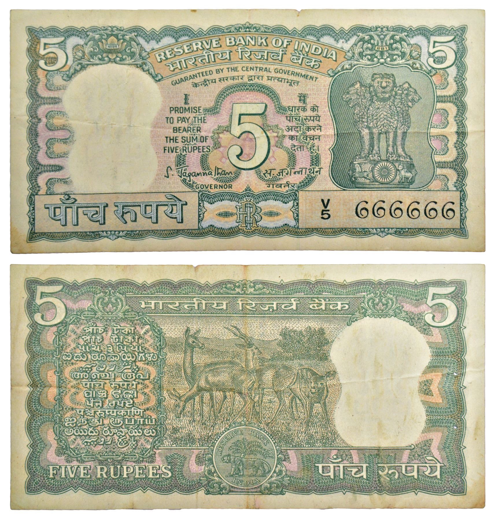 5 rupees, fancy number, ND (1970), signed by S. Jagannathan, without inset, incorrect urdu, serial no.: V5 666666, J&R 6.3.8.1A, fold marks.