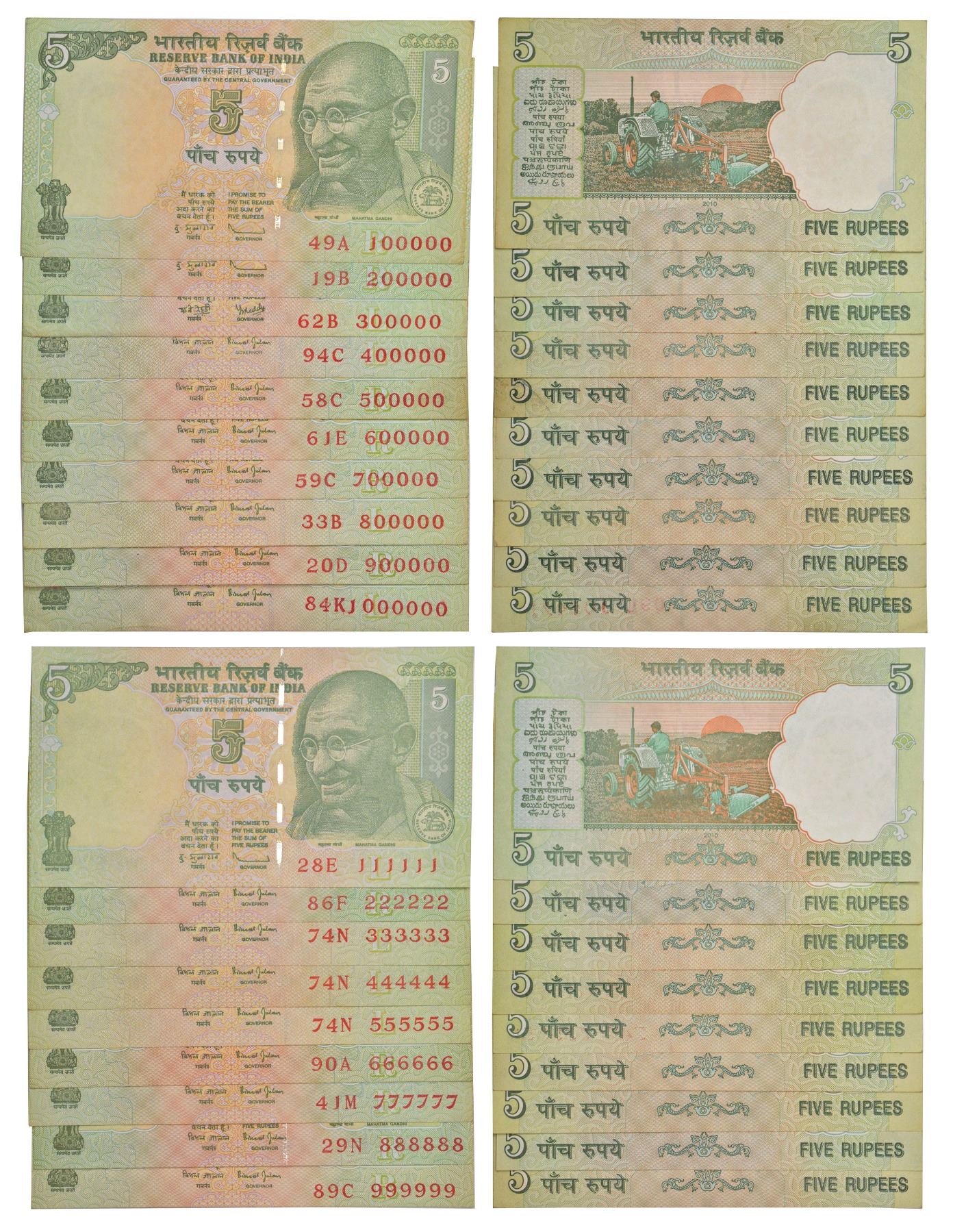 5 rupees, fancy number set of 19 notes, Gandhi series, serial no.: 111111 to 999999 and 100000 to 1000000, serial no. 111111, signed by Bimal Jalan; serial no. 100000, 200000 signed by D. Subbarao; serial no. 300000, signed by Y.V. Reddy and rest all notes signed by Bimal Jalan. (19 notes)
