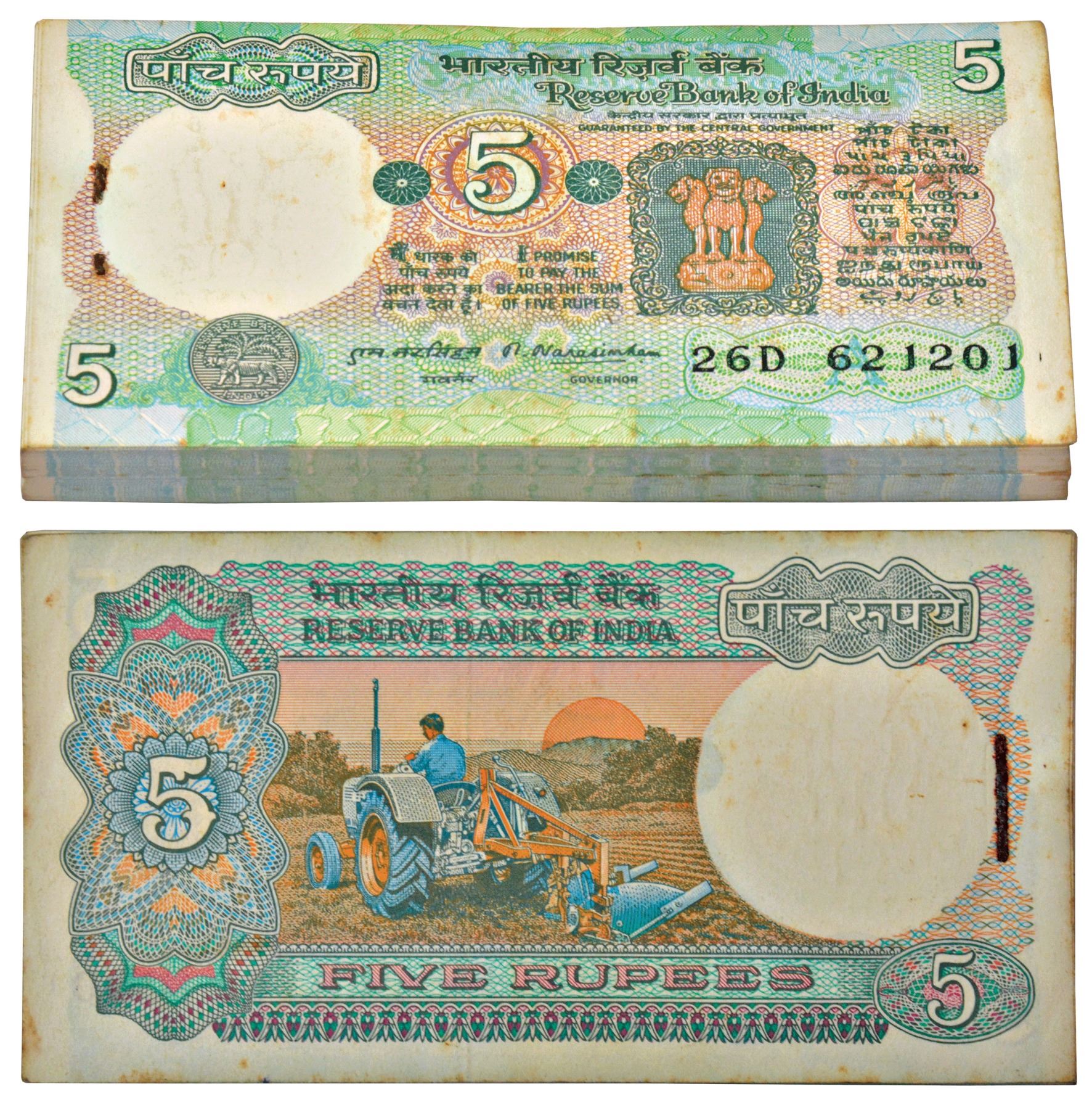 5 rupees, full packet of 100 notes, ND (1977), signed by M. Narasimham, inset 'A', serial no.: 26D 621201 to 621300, minor stain marks and slight rust pin. (100 notes)