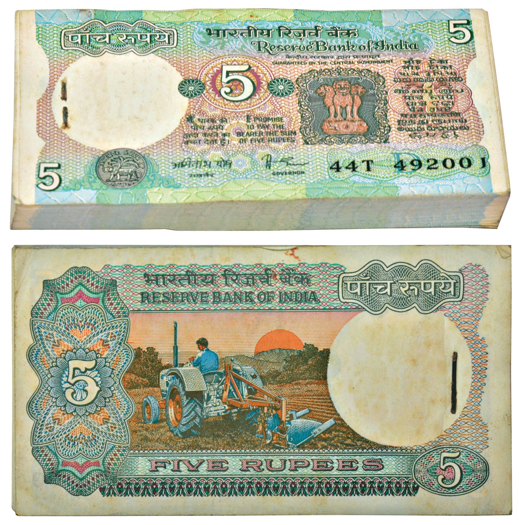 5 rupees, full packet of 100 notes, ND (1985), signed by Amitabh Ghosh, inset 'D', serial no.: 44T 492001 to 492100, slight stain marks on edge. (100 notes)
