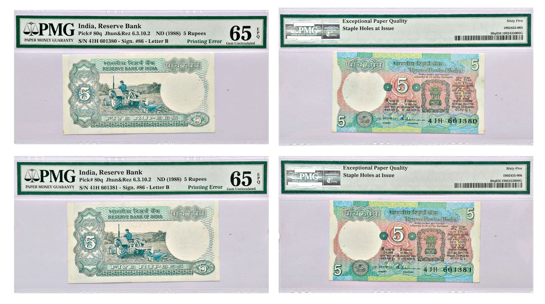 5 rupees, misprint (2), Tractor series, ND (1990-1992), signed by S. Venkitaramanan, inset 'B', serial no.: 41H 601380/381, some colour missing on reverse on both notes. (2 notes)