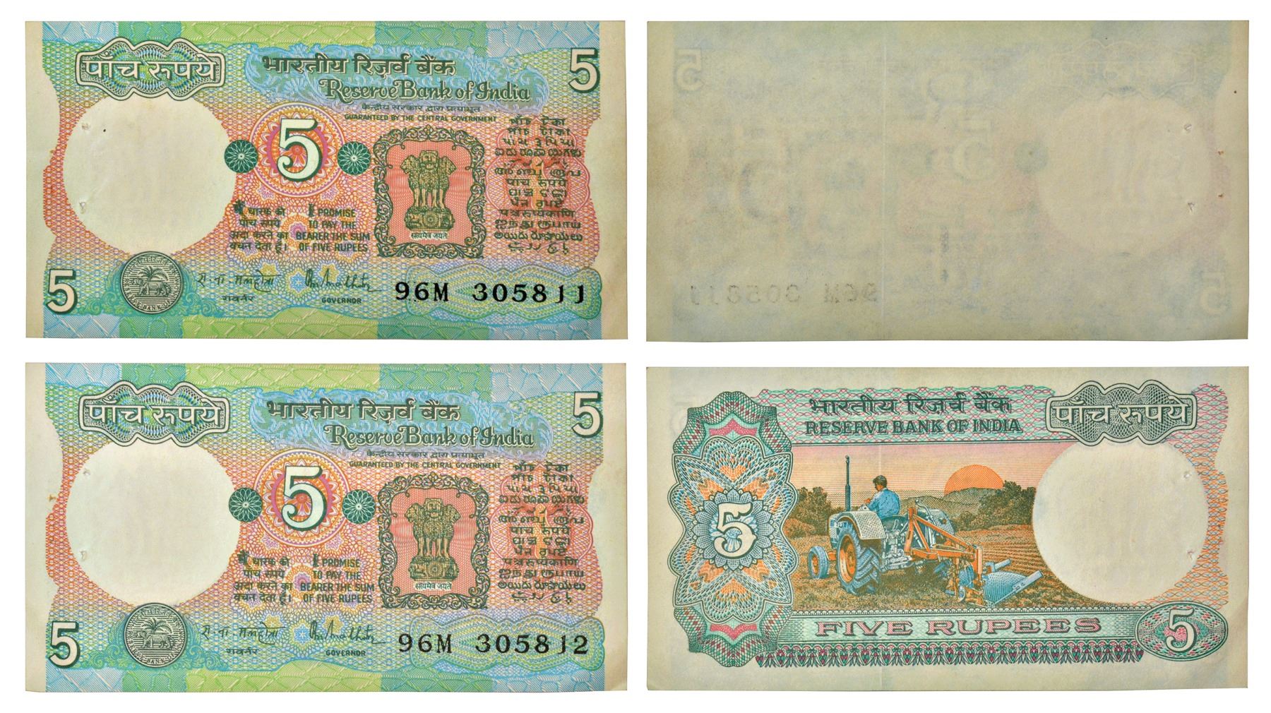 5 rupees, misprint, Tractor series, ND (1985-1990), signed by R.N. Malhotra, without inset, serial no.: 96M 305811, reverse part unprinted.