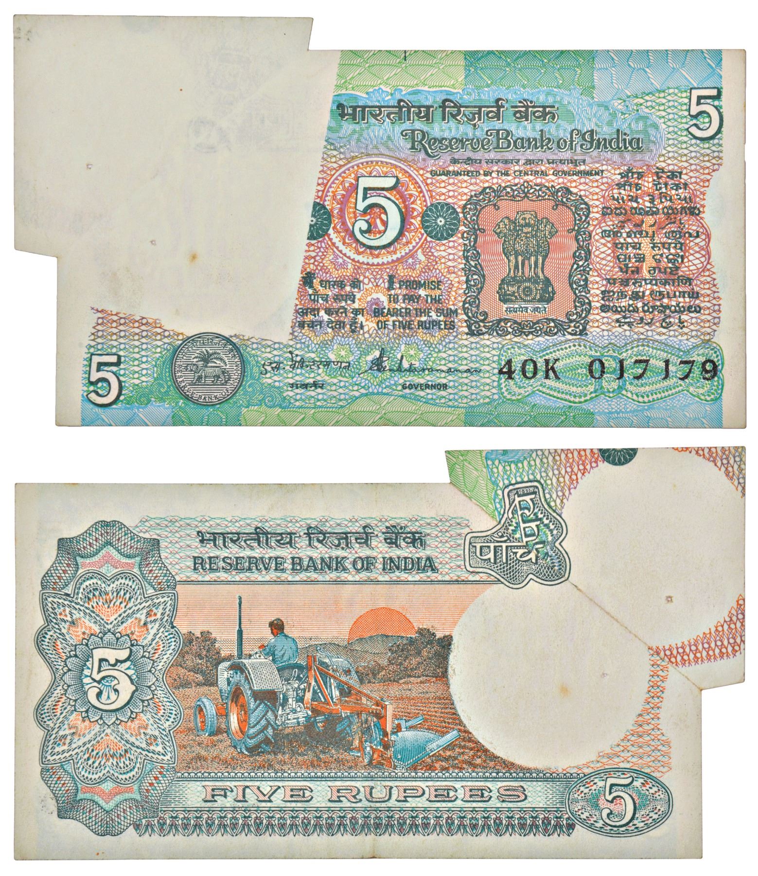 5 rupees, misprint, Tractor series, ND (1990-1992), signed by S. Venkitaramanan, inset 'B', serial no.: 40K 017179, flip error on obverse.