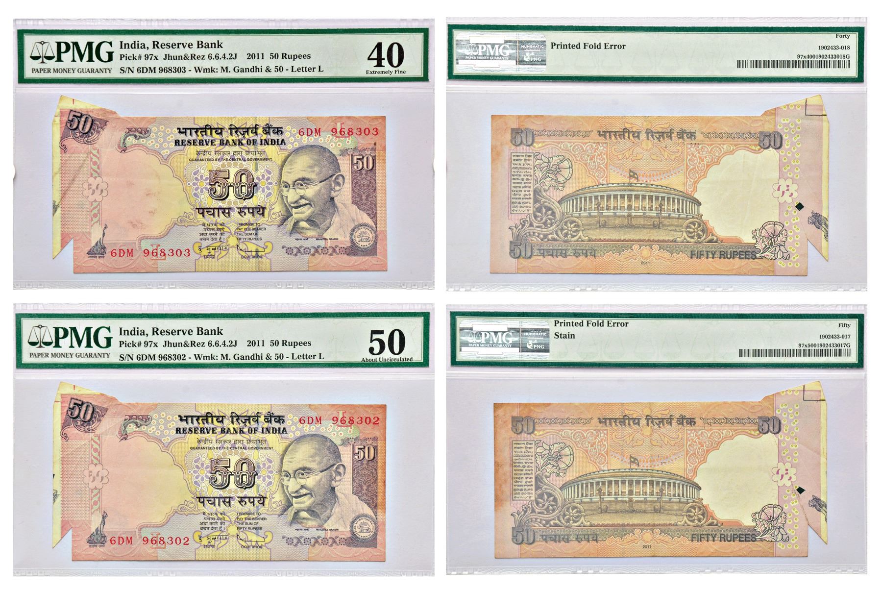 50 rupees (2), misprint, Parliament series, 2012, signed by D. Subbarao, inset 'L', two consecutive serial no: 6DM 968302/303, flip error extra paper on left side margin. (2 notes)