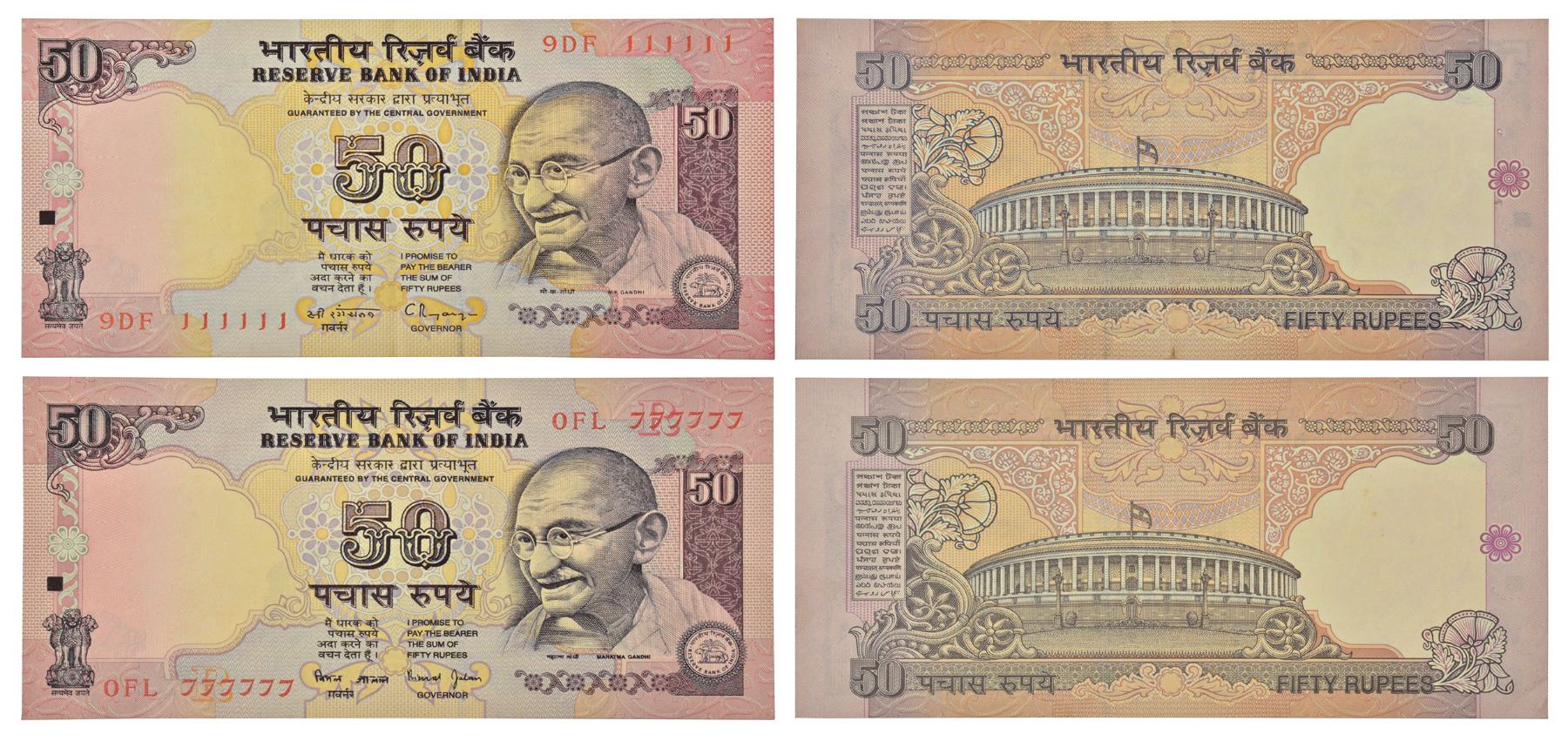 50 rupees, fancy number notes (2), Gandhi series, 1x without year, signed by C. Rangarajan, without inset, serial no.: 9DF 111111 and 1x without year, signed by Bimal Jalan, inset 'R', serial no.: 0FL 777777. (2 notes)