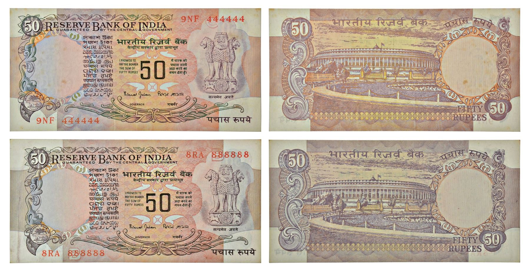 50 rupees, fancy number notes (2), Parliament House series, ND (1997-2003), signed by Bimal Jalan, inset 'C' and 'B', serial no.: 9NF 444444, 8RA 888888, slight stain marks on 1st note. (2 notes)