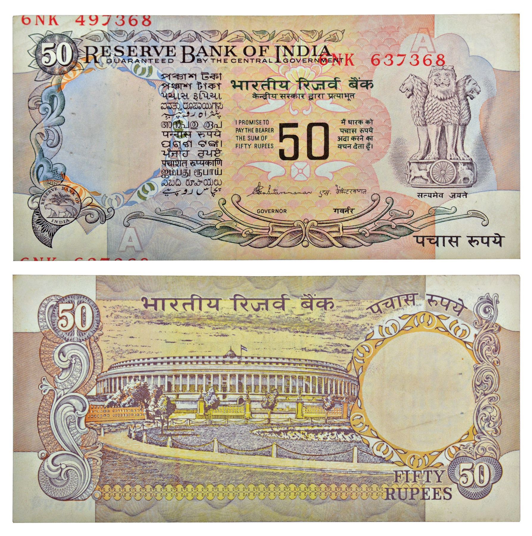 50 rupees, misprint, ND (1990-1992), signed by S. Venkataraman, inset 'A', serial no.: 6NK 497368 & 6NK 637368, both serial numbers are different and other serial number partly seen on lower left side.