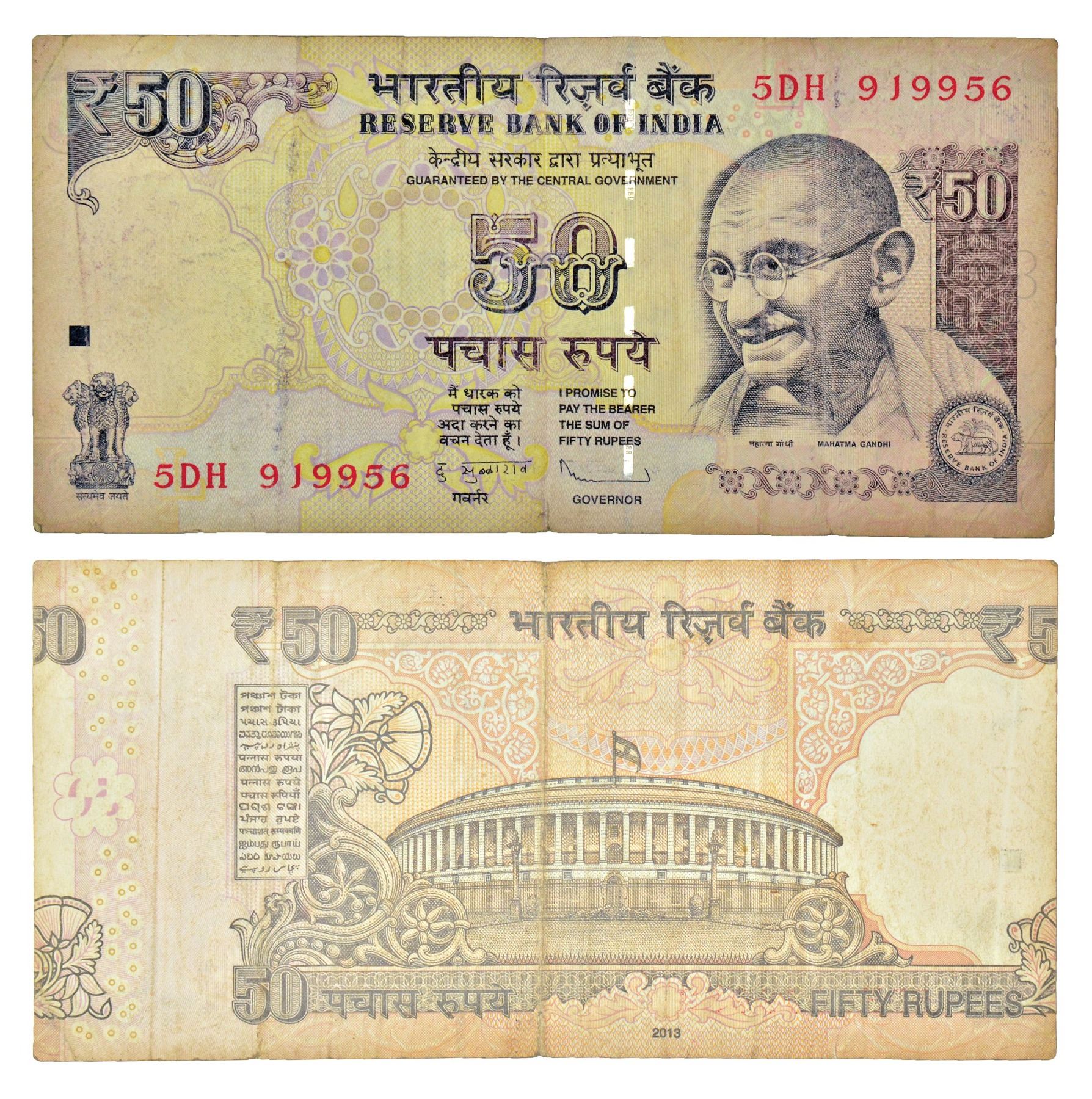 50 rupees, misprint, Parliament House series, 2013, signed by D. Subbarao, without inset, serial no.: 5DH 919956, vertical cutting error.